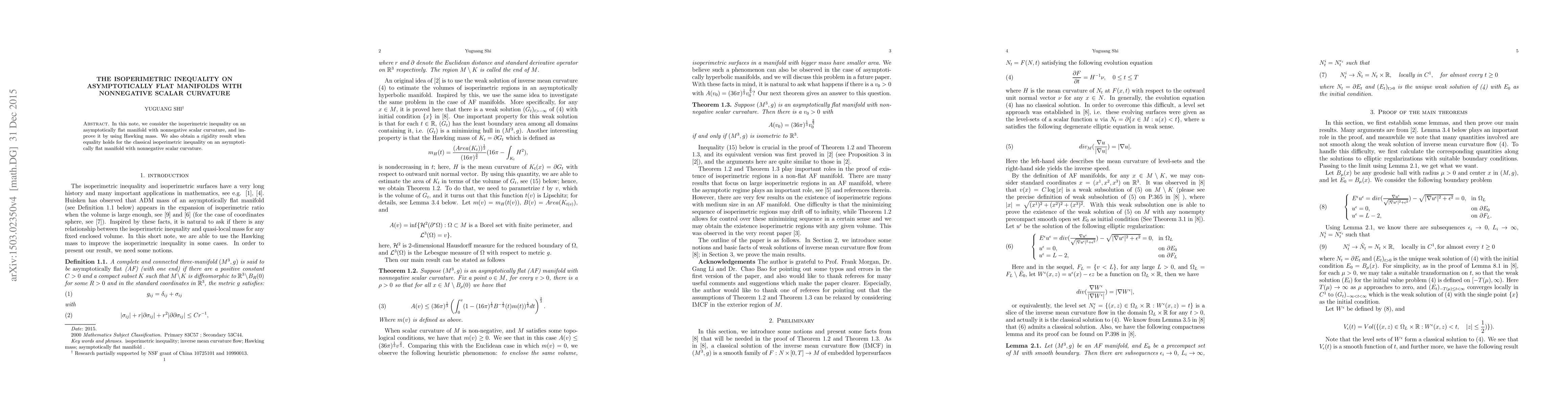 The work presents an improvement and refinement of the isoperimetric inequality, incorporating Hawking mass and providing a rigidity result, which extends and complements previous findings in the field.