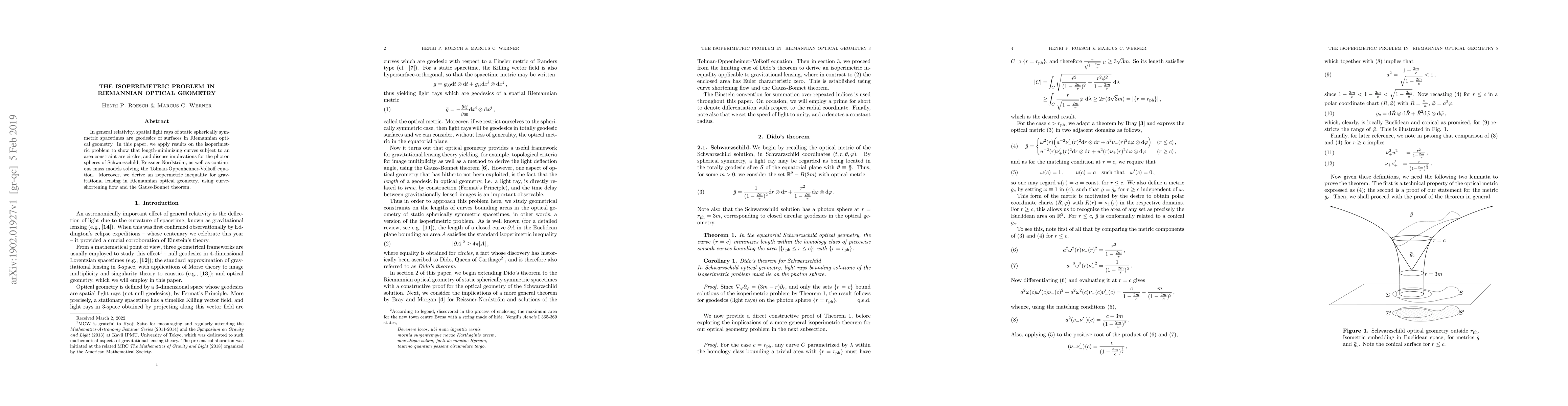 This paper uses results from the isoperimetric problem to demonstrate that in Riemannian optical geometry, length-minimizing curves constrained by area are circles, relevant to photon spheres in static spherically symmetric spacetimes, and derives an isoperimetric inequality for gravitational lensing.