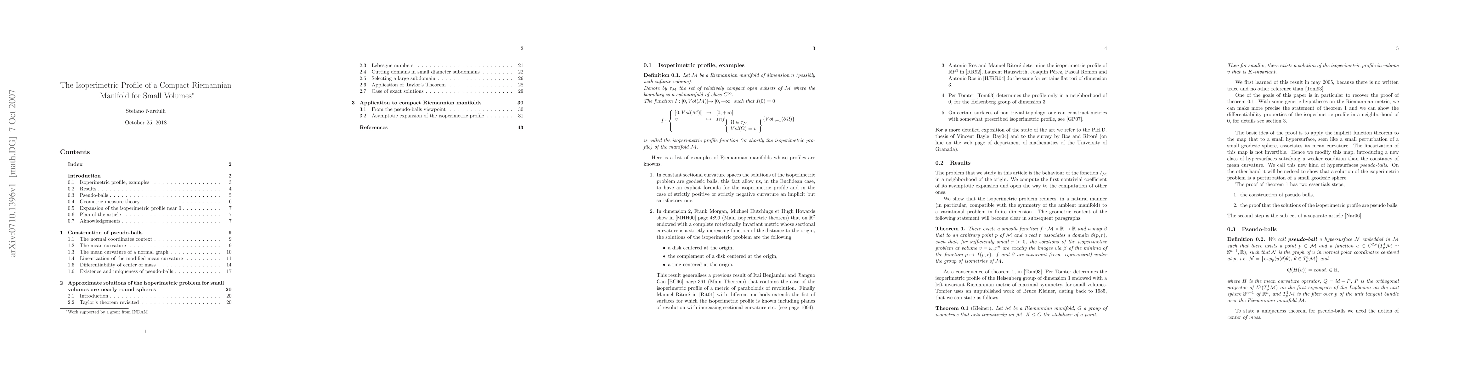 We show that, the solutions of the isoperimetric problem for small volumes are $C^{2,\alpha}$-close to small spheres. On the way, we define a class of submanifolds called pseudo balls, defined by an equation weaker than constancy of mean curvature. We show that in a neighborhood of each point of a compact riemannian manifold, there is a unique family concentric pseudo balls which contains all the pseudo balls $C^{2,\alpha}$-close to small spheres. This allows us to reduce the isoperimetric problem for small volumes to a variational problem in finite dimension.