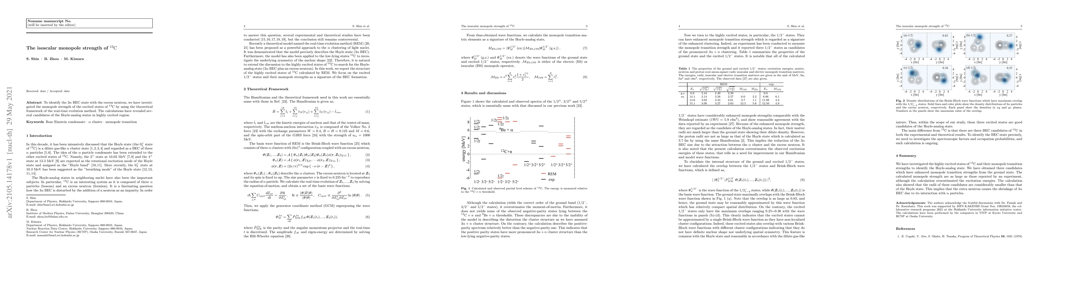 To identify the 3alpha BEC state with the excess neutron, we have investigated the monopole strength of the excited states of 13C by using the theoretical framework of the real-time evolution method. The calculations have revealed several candidates of the Hoyle-analog states in a highly excited region.
