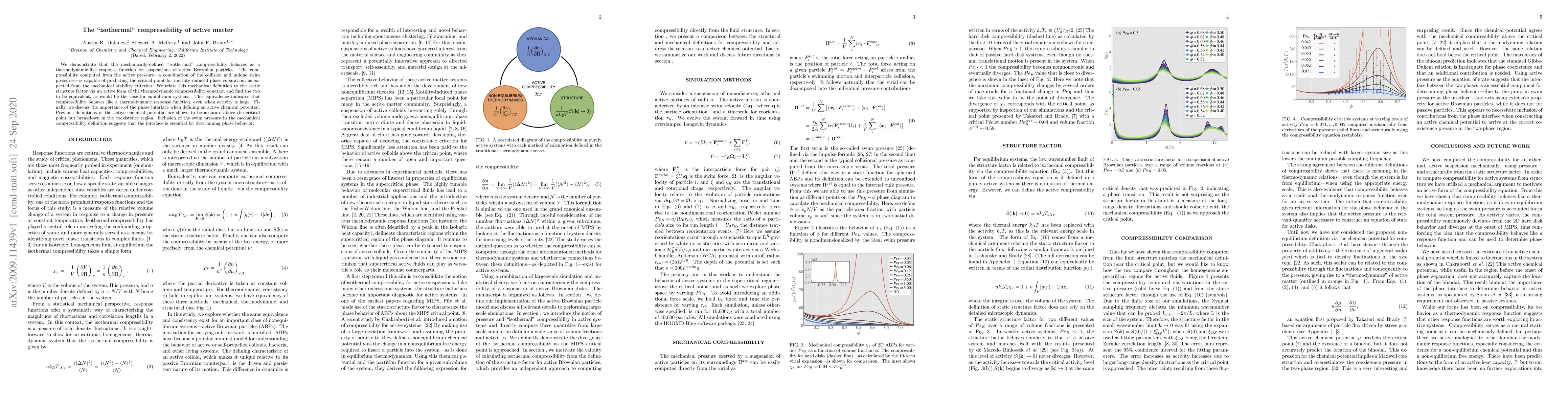 The paper introduces an active form of the compressibility equation, relating the static structure factor to the particle flux, and demonstrates that compressibility behaves like a thermodynamic response function for active matter systems, even when activity is large.