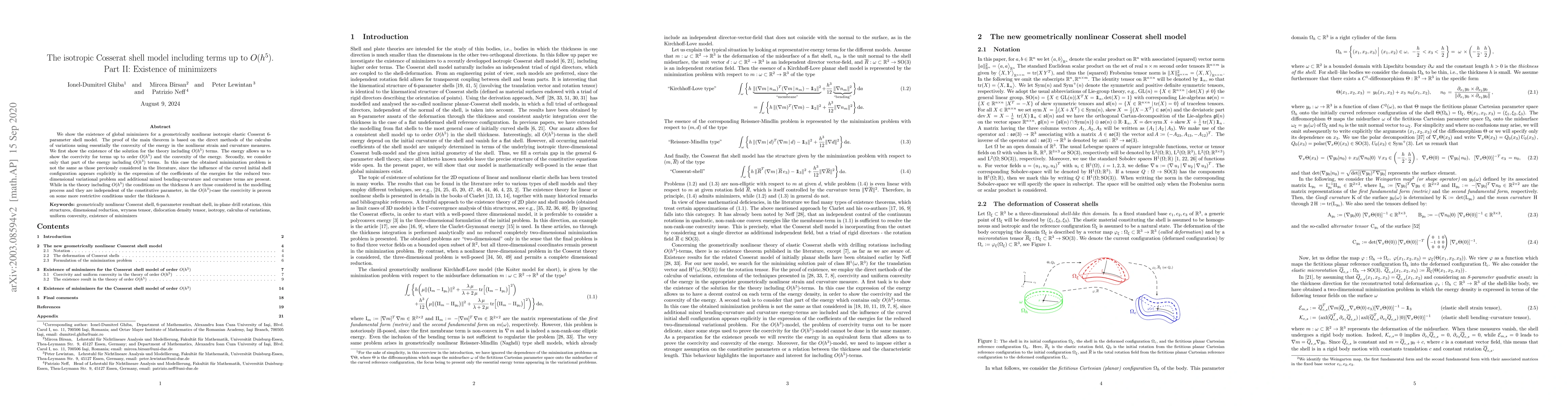 This paper demonstrates the existence of global minimizers for a nonlinear isotropic elastic Cosserat shell model, proving the existence of solutions for both $O(h^5)$ and $O(h^3)$ terms using direct methods of calculus of variations. The convexity and coercivity of the energy are key to establishing these results.