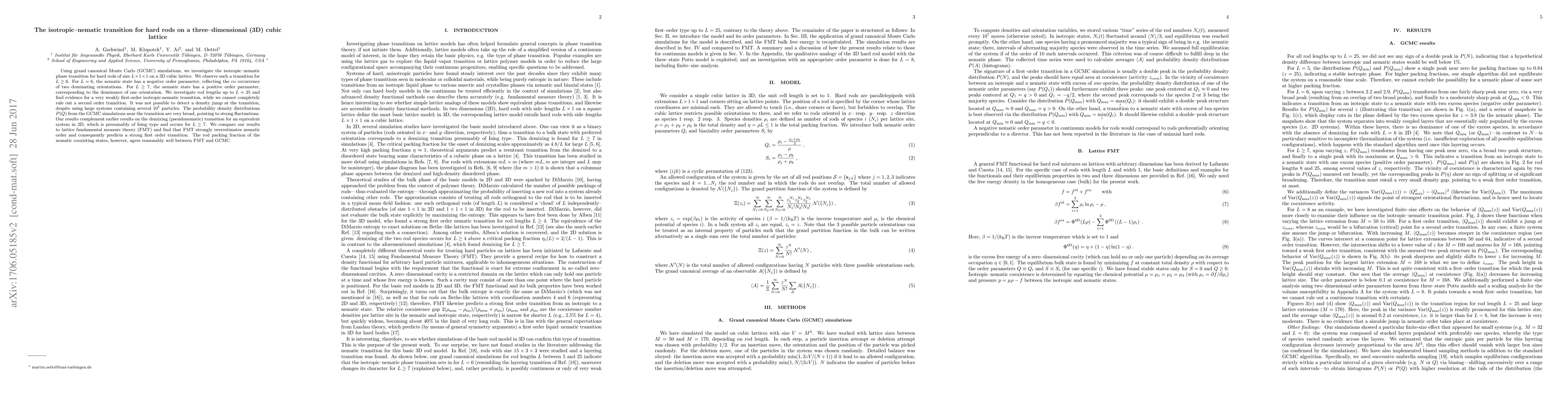 This study uses grand canonical Monte Carlo simulations to explore the isotropic-nematic phase transition in hard rods on a 3D cubic lattice, finding a weakly first-order transition for rod lengths L ≥ 6, with differing order parameters and strong fluctuations. Lattice fundamental measure theory overestimates nematic order and predicts a stronger transition compared to simulation results.