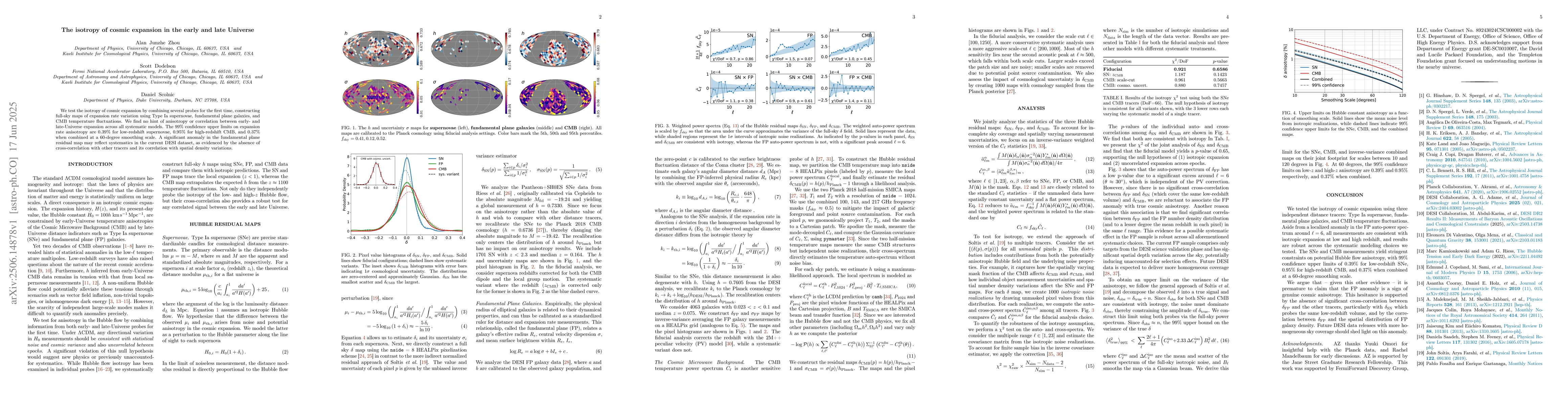 We test the isotropy of cosmic expansion by combining several probes for the first time, constructing full-sky maps of expansion rate variation using Type Ia supernovae, fundamental plane galaxies, and CMB temperature fluctuations. We find no hint of anisotropy or correlation between early- and late-Universe expansion across all systematic models. The 99% confidence upper limits on expansion rate anisotropy are 0.39% for low-redshift supernovae, 0.95% for high-redshift CMB, and 0.37% when combined at a 60-degree smoothing scale. A significant anomaly in the fundamental plane residual map may reflect systematics in the current DESI dataset, as evidenced by the absence of cross-correlation with other tracers and its correlation with spatial density variations.