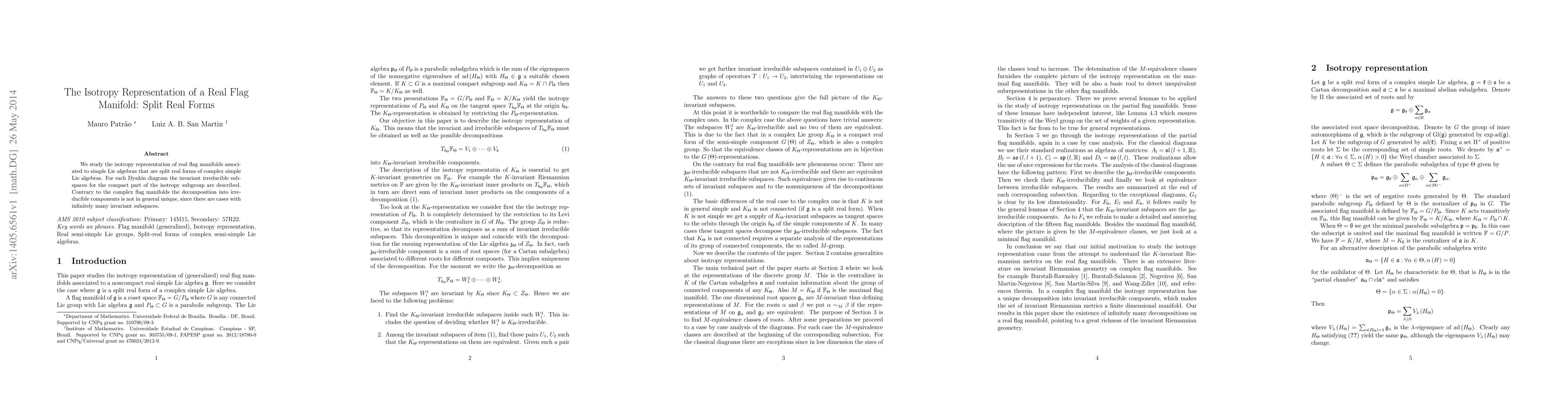 This paper investigates the isotropy representation of real flag manifolds derived from split real forms of complex simple Lie algebras, detailing invariant irreducible subspaces for the compact isotropy subgroup. Unlike complex flag manifolds, the decomposition into irreducible components is not unique due to the existence of infinitely many invariant subspaces.