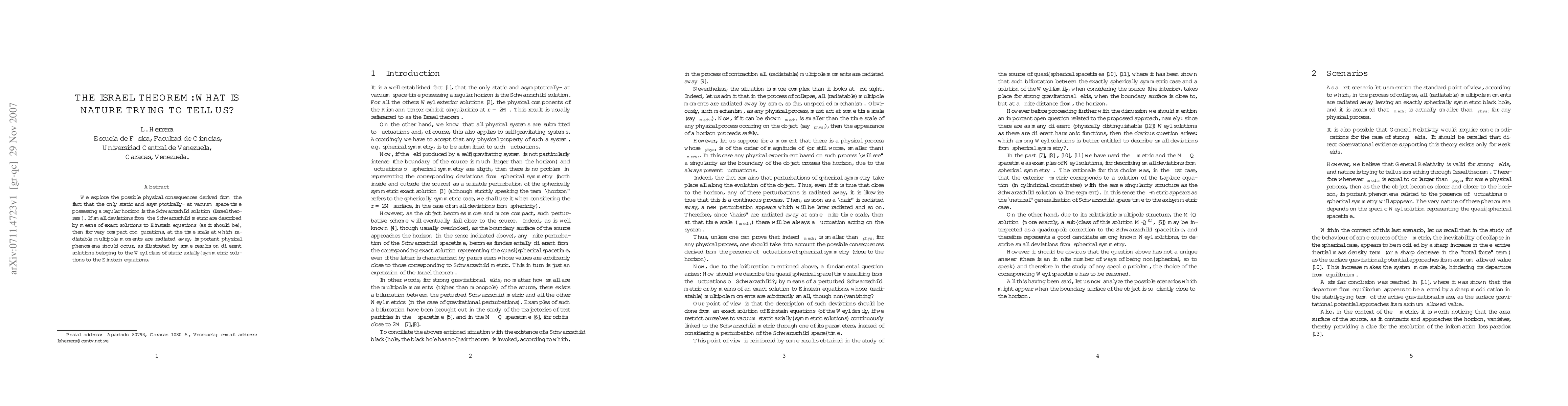 We explore the possible physical consequences derived from the fact that the only static and asymptotically-flat vacuum space-time possessing a regular horizon is the Schwarzschild solution (Israel theorem). If small deviations from the Schwarzschild metric are described by means of exact solutions to Einstein equations (as it should be), then for very compact configurations, at the time scale at which radiatable multipole moments are radiated away, important physical phenomena should occur, as illustrated by some results on different solutions beloging to the Weyl class of static axially--symmetric solutions to the Einstein equations.