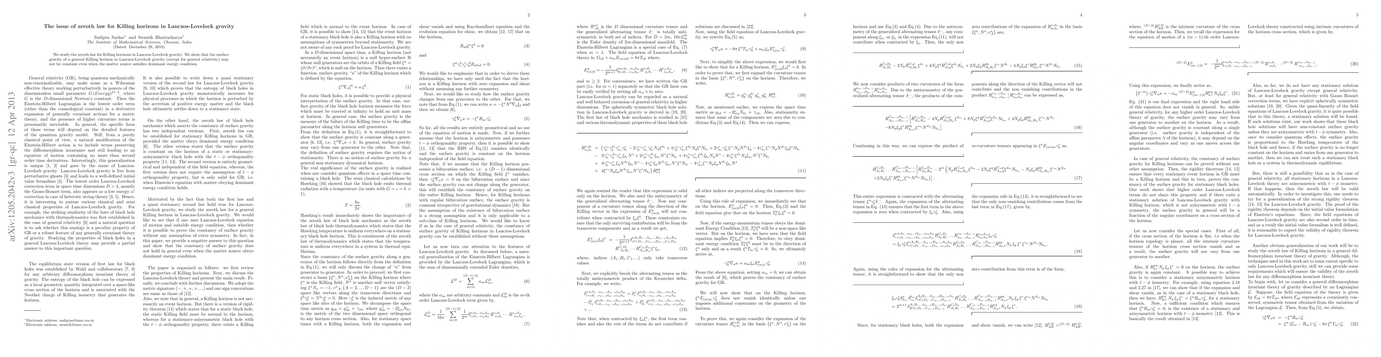 Summary: This paper investigates the zeroth law for Killing horizons in Lanczos-Lovelock gravity, revealing that surface gravity may not remain constant on general Killing horizons, even when the dominant energy condition is satisfied, unlike in general relativity.
