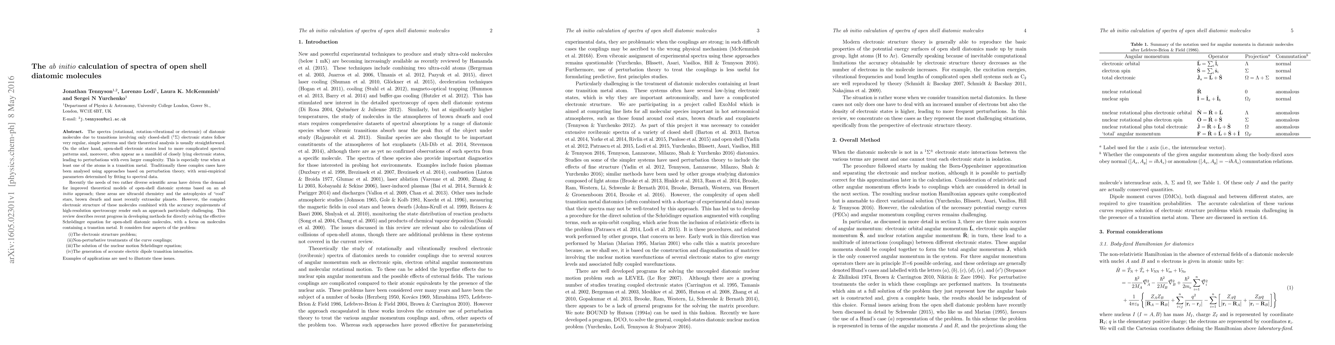 The spectra (rotational, rotation-vibrational or electronic) of diatomic molecules due to transitions involving only closed-shell ($^1\Sigma$) electronic states follow very regular, simple patterns and their theoretical analysis is usually straightforward. On the other hand, open-shell electronic states lead to more complicated spectral patterns and, moreover, often appear as a manifold of closely lying electronic states, leading to perturbations with even larger complexity. This is especially true when at least one of the atoms is a transition metal. Traditionally these complex cases have been analysed using approaches based on perturbation theory, with semi-empirical parameters determined by fitting to spectral data. Recently the needs of two rather diverse scientific areas have driven the demand for improved theoretical models of open-shell diatomic systems based on an \emph{ab initio} approach, these areas are ultracold chemistry and the astrophysics of "cool" stars, brown dwarfs and most recently extrasolar planets. However, the complex electronic structure of these molecules combined with the accuracy requirements of high-resolution spectroscopy render such an approach particularly challenging. This review describes recent progress in developing methods for directly solving the effective Schr\"odinger equation for open-shell diatomic molecules, with a focus on molecules containing a transtion metal. It considers four aspects of the problem: 1. The electronic structure problem, 2. Non-perturbative treatments of the curve couplings, 3. The solution of the nuclear motion Schr\"odinger equation, 4. The generation of accurate electric dipole transition intensities. Examples of applications are used to illustrate these issues.