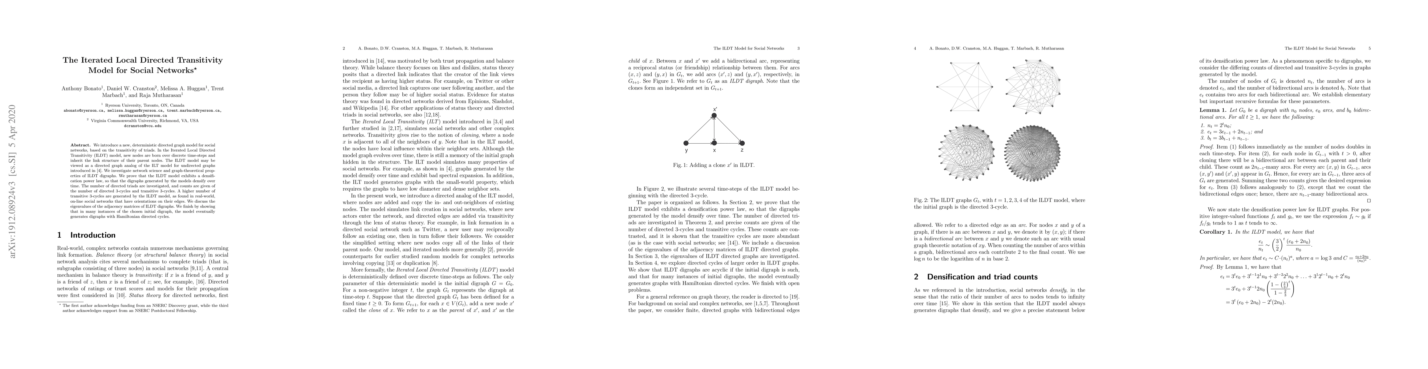 The Iterated Local Directed Transitivity (ILDT) model introduces a directed graph framework for social networks based on triadic transitivity. It generates densifying digraphs over time, with a higher number of transitive 3-cycles akin to real-world online social networks, and often produces Hamiltonian cycles.