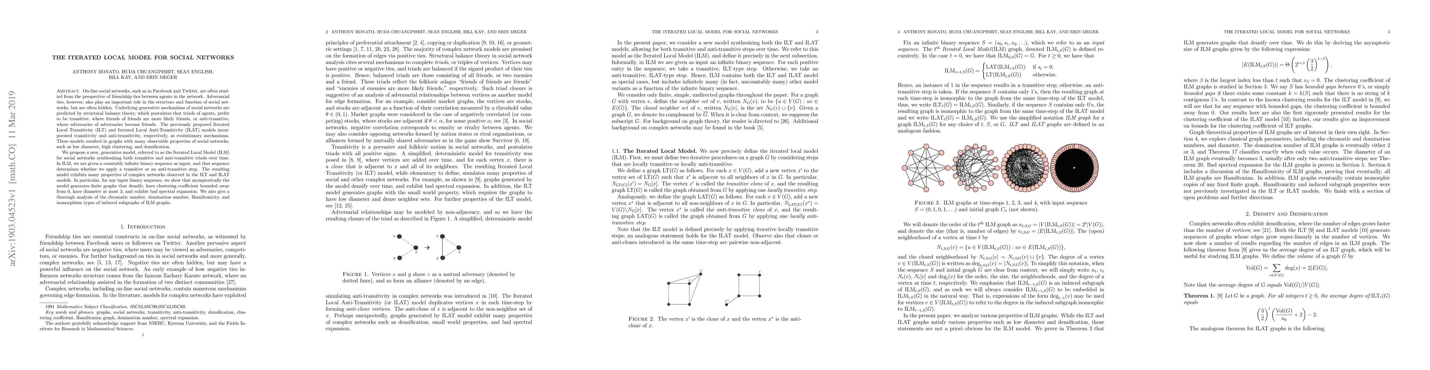 The Iterated Local Model (ILM) synthesizes transitive and anti-transitive triads to generate social network graphs that exhibit properties like low diameter, high clustering, and densification, mirroring real-world social networks. The model uses a binary sequence to determine the application of transitive or anti-transitive steps, resulting in graphs with significant spectral and structural characteristics.
