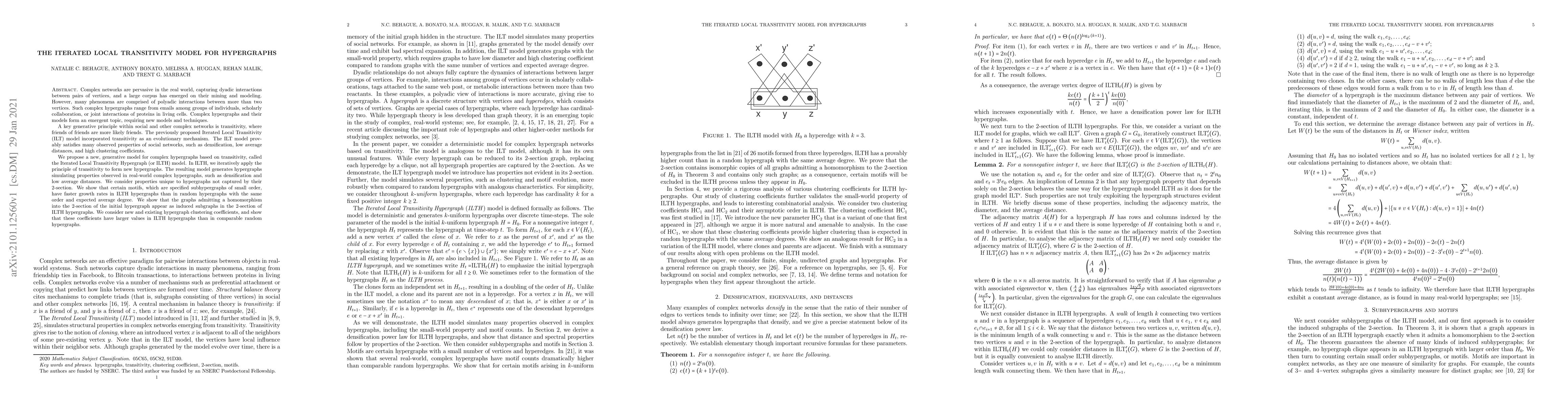 The paper proposes the Iterated Local Transitivity Hypergraph (ILTH) model to generate complex hypergraphs based on transitivity, showing it simulates properties like densification and low average distances observed in real-world hypergraphs, while also highlighting unique hypergraph motifs and higher clustering coefficients compared to random hypergraphs.