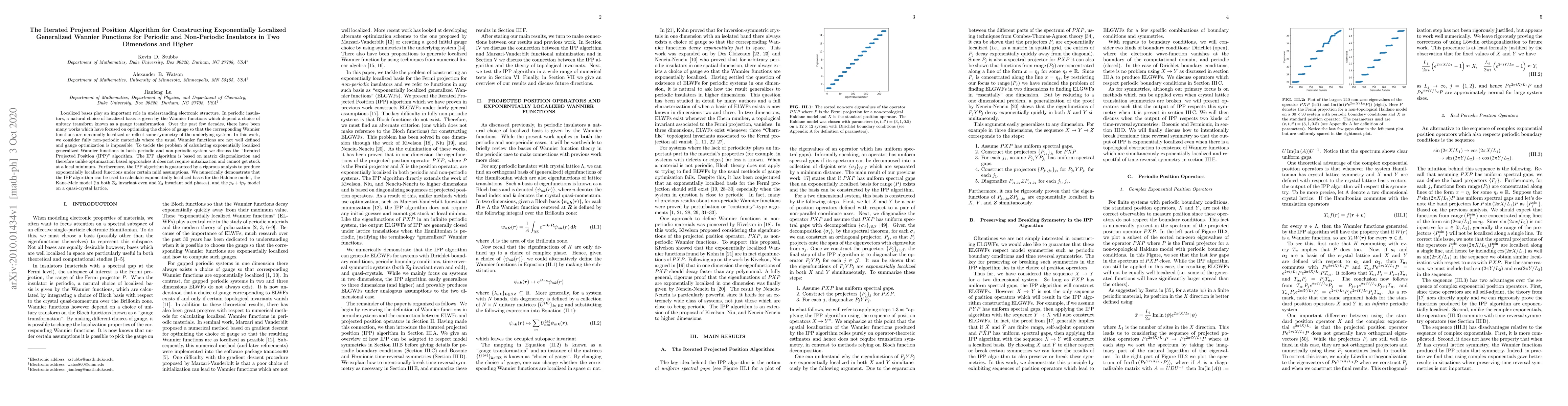 Localized bases play an important role in understanding electronic structure. In periodic insulators, a natural choice of localized basis is given by the Wannier functions which depend a choice of unitary transform known as a gauge transformation. Over the past few decades, there have been many works which have focused on optimizing the choice of gauge so that the corresponding Wannier functions are maximally localized or reflect some symmetry of the underlying system. In this work, we consider fully non-periodic materials where the usual Wannier functions are not well defined and gauge optimization is impossible. To tackle the problem of calculating exponentially localized generalized Wannier functions in both periodic and non-periodic system we discuss the "Iterated Projected Position (IPP)" algorithm. The IPP algorithm is based on matrix diagonalization and therefore unlike optimization based approaches it does not require initialization and cannot get stuck at a local minimum. Furthermore, the IPP algorithm is guaranteed by a rigorous analysis to produce exponentially localized functions under certain mild assumptions. We numerically demonstrate that the IPP algorithm can be used to calculate exponentially localized bases for the Haldane model, the Kane-Mele model (in both $\mathbb{Z}_2$ invariant even and $\mathbb{Z}_2$ invariant odd phases), and the $p_x + i p_y$ model on a quasi-crystal lattice.