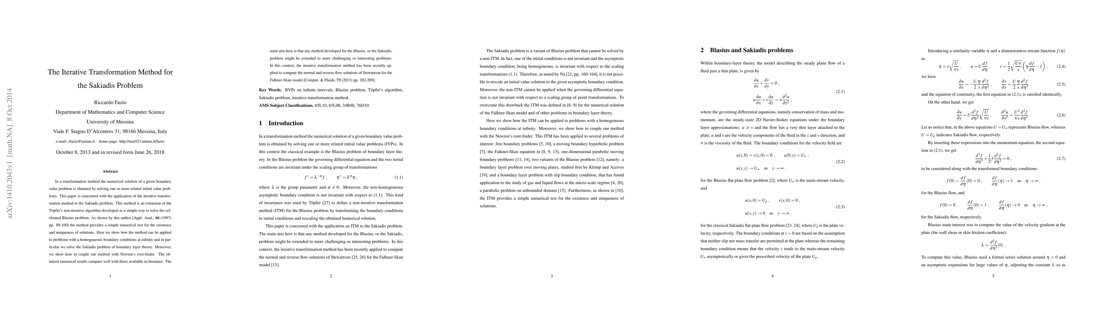 In a transformation method the numerical solution of a given boundary value problem is obtained by solving one or more related initial value problems. This paper is concerned with the application of the iterative transformation method to the Sakiadis problem. This method is an extension of the Toepfer's non-iterative algorithm developed as a simple way to solve the celebrated Blasius problem. As shown by this author [Appl. Anal., 66 (1997) pp. 89-100] the method provides a simple numerical test for the existence and uniqueness of solutions. Here we show how the method can be applied to problems with a homogeneous boundary conditions at infinity and in particular we solve the Sakiadis problem of boundary layer theory. Moreover, we show how to couple our method with Newton's root-finder. The obtained numerical results compare well with those available in literature. The main aim here is that any method developed for the Blasius, or the Sakiadis, problem might be extended to more challenging or interesting problems. In this context, the iterative transformation method has been recently applied to compute the normal and reverse flow solutions of Stewartson for the Falkner-Skan model [Comput. & Fluids, 73 (2013) pp. 202-209].