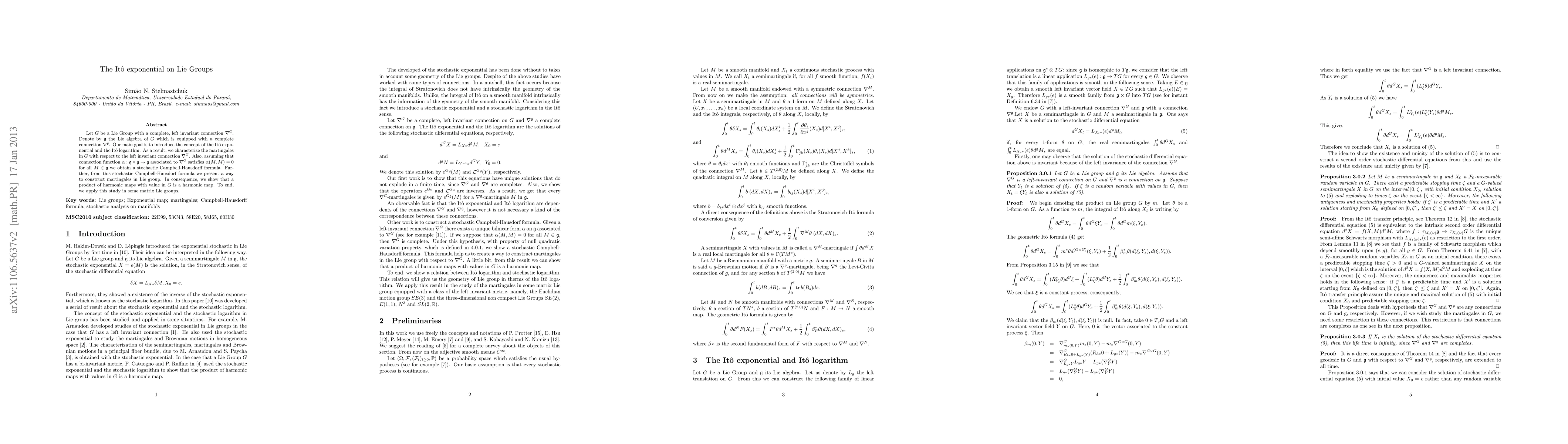 Let $G$ be a Lie Group with a left invariant connection $\nabla^{G}$. Denote by $\g$ the Lie algebra of $G$, which is equipped with a connection $\nabla^{\g}$. Our main is to introduce the concept of the It\^o exponential and the It\^o logarithm, which take in account the geometry of the Lie group $G$ and the Lie algebra $\g$. This definition characterize directly the martingales in $G$ with respect to the left invariant connection $\nabla^{G}$. Further, if any $\nabla^{\g}$ geodesic in $\g$ is send in a $\nabla^{G}$ geodesic we can show that the It\^o exponential and the It\^o logarithm are the same that the stochastic exponential and the stochastic logarithm due to M. Hakim-Dowek and D. L\'epingle in [10]. Consequently, we have a Campbell-Hausdorf formula. From this formula we show that the set of affine maps from $(M,\nabla^{G})$ into $(G,\nabla^{G})$ is a subgroup of the Loop group. As in general, the Lie algebra is considered as smooth manifold with a flat connection, we show a Campbell-Hausdorf formula for a flat connection on $\g$ and a bi-invariant connection on $G$. To this main we introduce the definition of the null quadratic variation property. To end, we use the Campbell-Hausdorff formula to show that a product of harmonic maps with value in $G$ is a harmonic map.