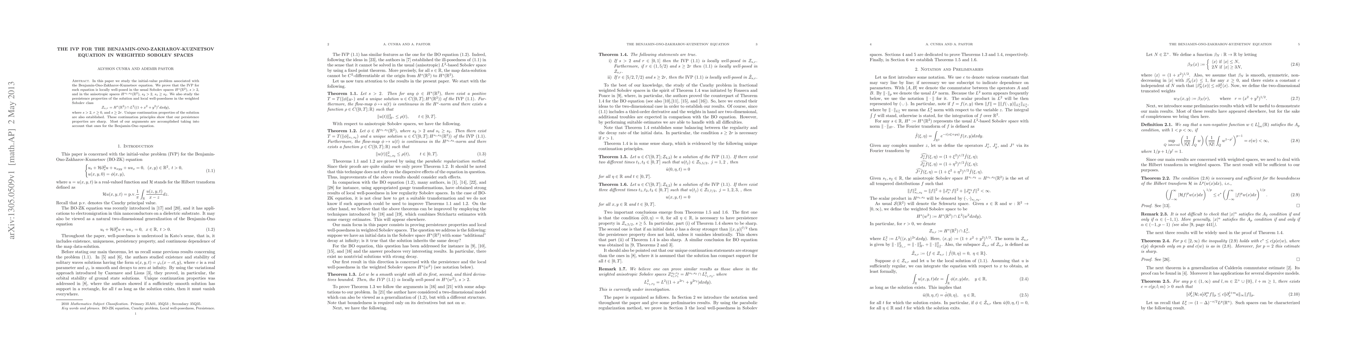 This paper investigates the initial-value problem for the Benjamin-Ono-Zakharov-Kuznetsov equation, proving local well-posedness in standard and anisotropic Sobolev spaces, and establishing persistence properties in weighted Sobolev spaces. Unique continuation principles are also demonstrated, showing sharp persistence properties.