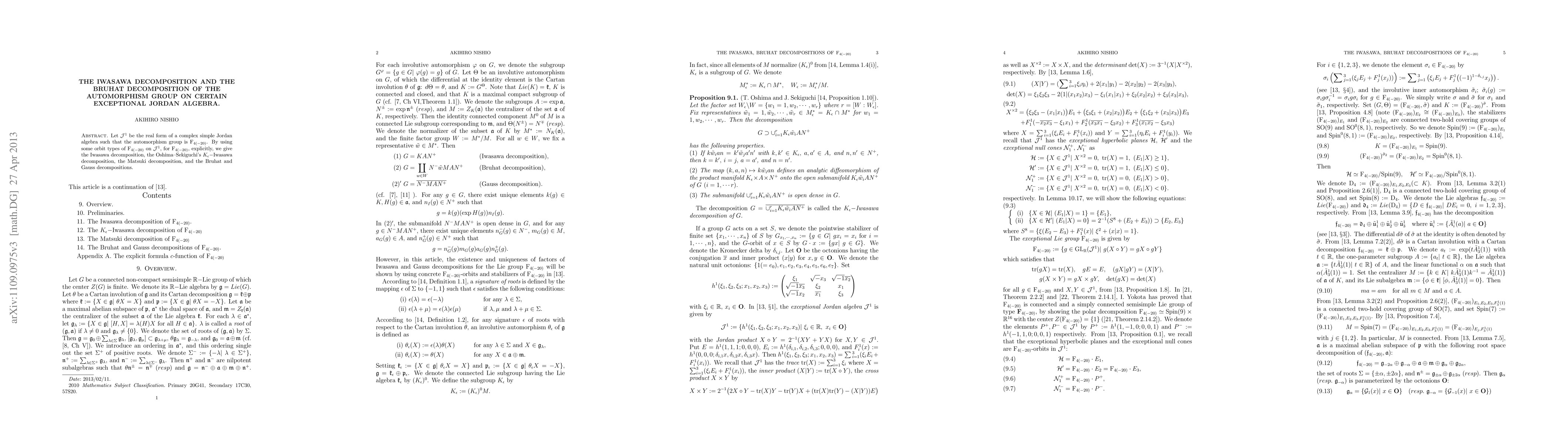 This paper explores the automorphism group $\mathrm{F}_{4(-20)}$ of the exceptional Jordan algebra $\mathcal{J}^1$, providing explicit Iwasawa, Oshima-Sekiguchi $K_{\epsilon}$-Iwasawa, Matsuki, Bruhat, and Gauss decompositions using orbit types of $\mathrm{F}_{4(-20)}$.