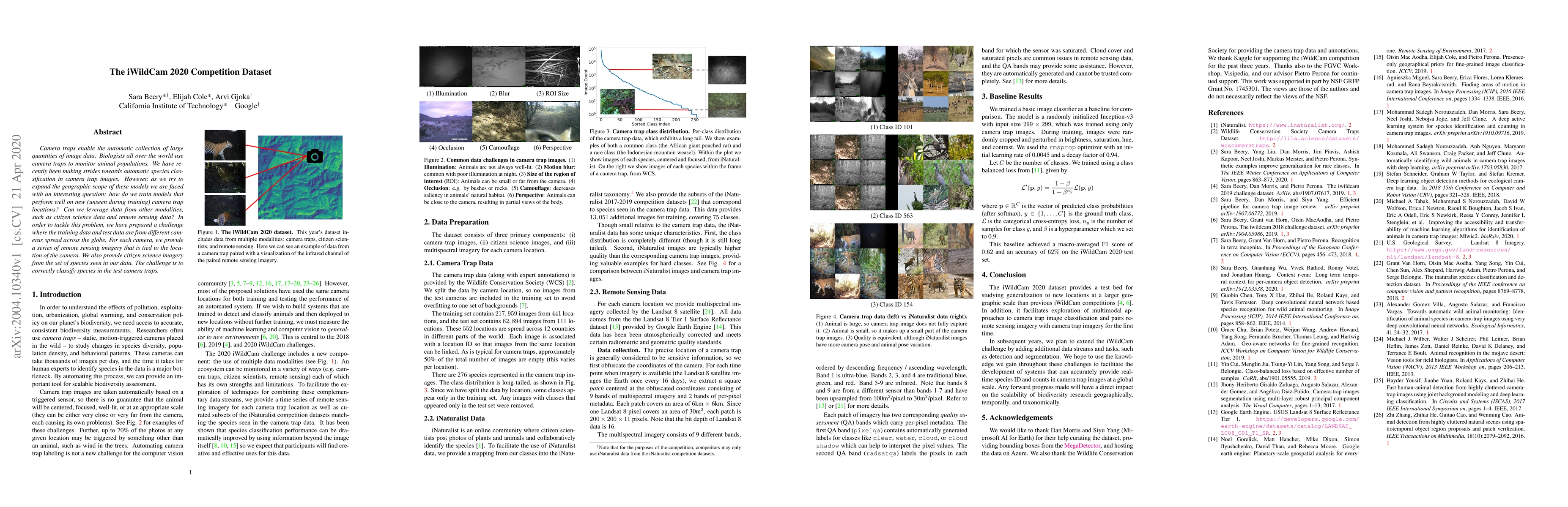 Camera traps enable the automatic collection of large quantities of image data. Biologists all over the world use camera traps to monitor animal populations. We have recently been making strides towards automatic species classification in camera trap images. However, as we try to expand the geographic scope of these models we are faced with an interesting question: how do we train models that perform well on new (unseen during training) camera trap locations? Can we leverage data from other modalities, such as citizen science data and remote sensing data? In order to tackle this problem, we have prepared a challenge where the training data and test data are from different cameras spread across the globe. For each camera, we provide a series of remote sensing imagery that is tied to the location of the camera. We also provide citizen science imagery from the set of species seen in our data. The challenge is to correctly classify species in the test camera traps.