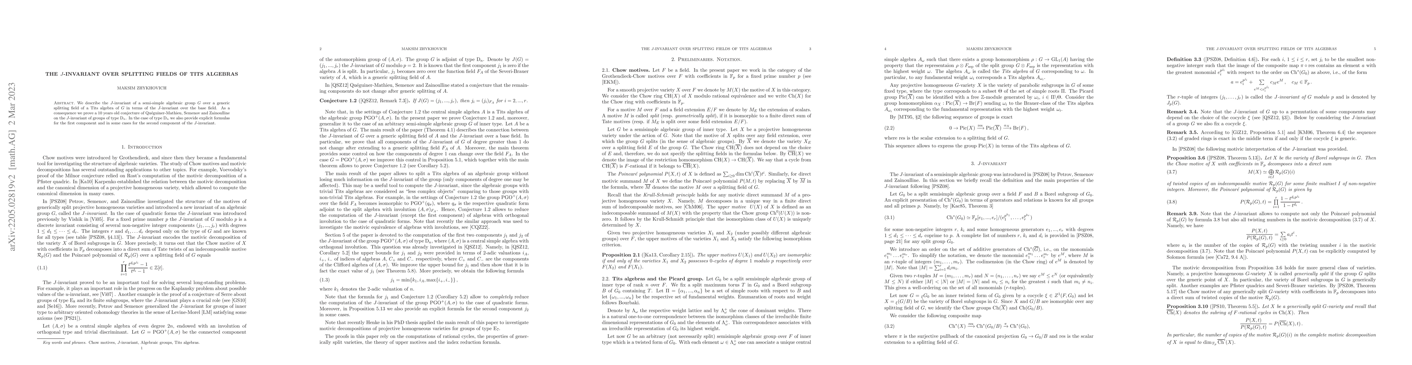 This paper explores the J-invariant of a semi-simple algebraic group G when defined over a generic splitting field derived from its Tits algebra, relating it to the J-invariant over a base field. The study focuses on the properties and behavior of the J-invariant in these contexts.