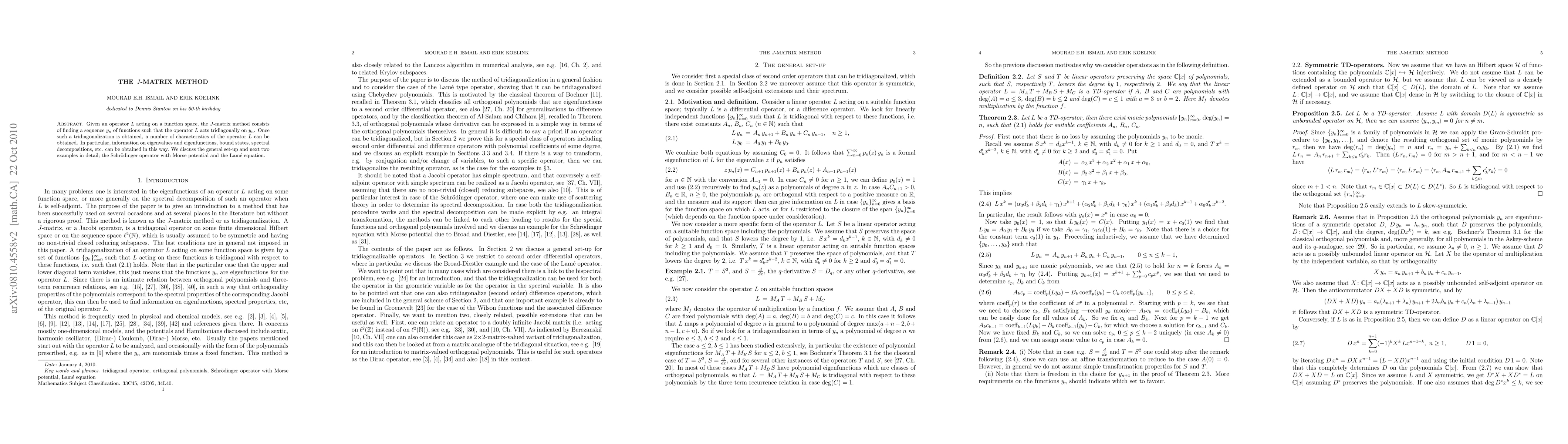 The J-matrix method allows for tridiagonalization of operators, enabling analysis of eigenvalues, eigenfunctions, and spectral decompositions. This technique is applied to the Schrodinger operator with Morse potential and the Lame equation.