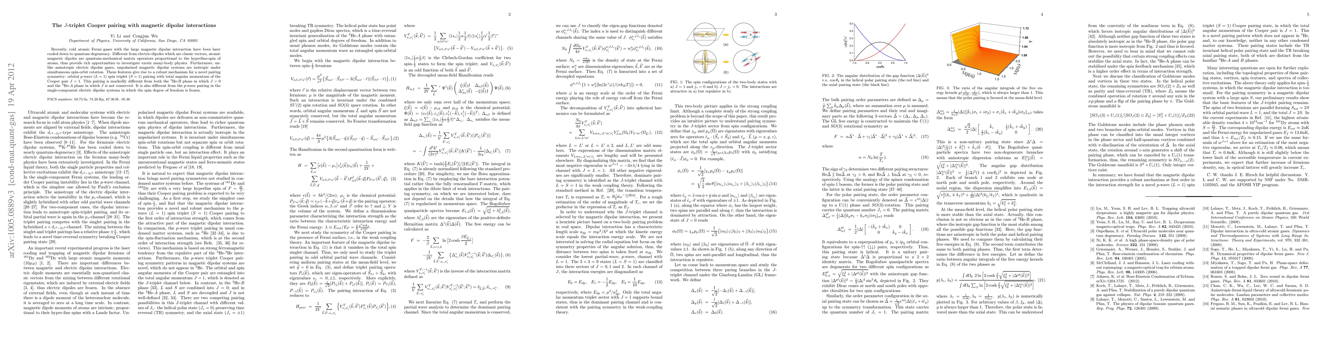 This paper investigates the novel J-triplet Cooper pairing in cold atomic Fermi gases with strong magnetic dipolar interactions, revealing an orbital p-wave spin triplet pairing with total angular momentum J=1, distinct from conventional pairing symmetries in $^3$He phases and electric dipolar systems.
