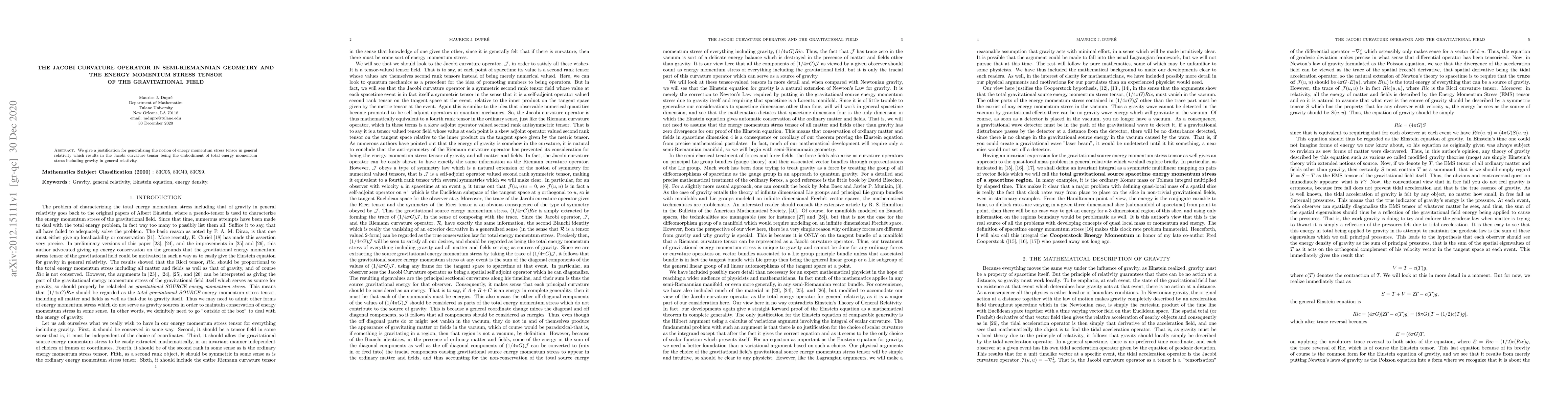 Summary: This paper generalizes the energy-momentum stress tensor in general relativity, proposing that the Jacobi curvature tensor encapsulates the total energy-momentum stress, including gravitational effects, in semi-Riemannian geometry.