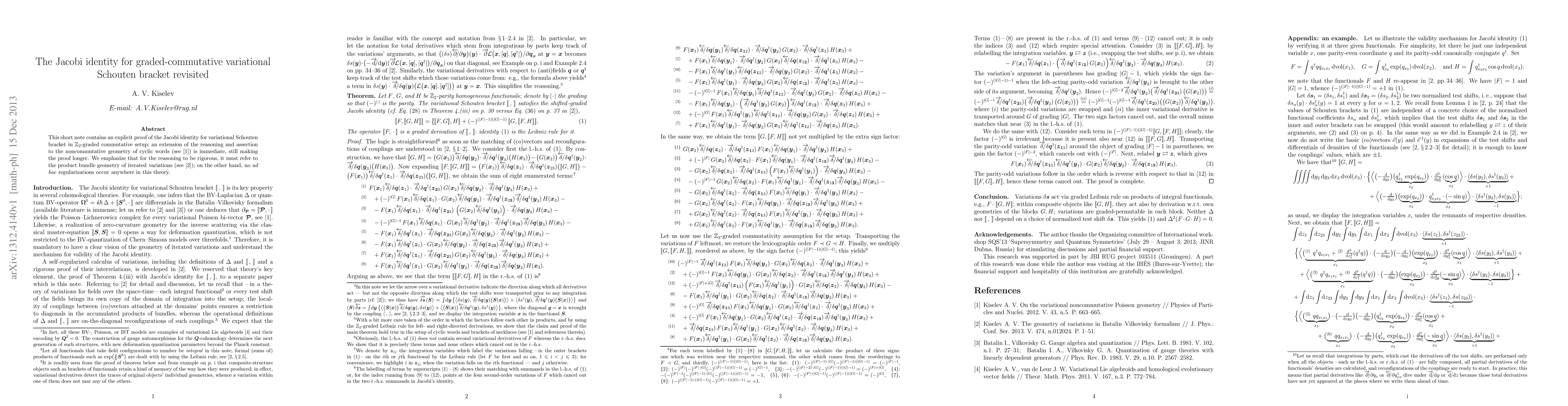 This short note contains an explicit proof of the Jacobi identity for variational Schouten bracket in $Z_2$-graded commutative setup. For the reasoning to be rigorous, it refers to the product bundle geometry of iterated variations (see arXiv:1312.1262 [math-ph]); no ad hoc regularizations occur anywhere in this theory.