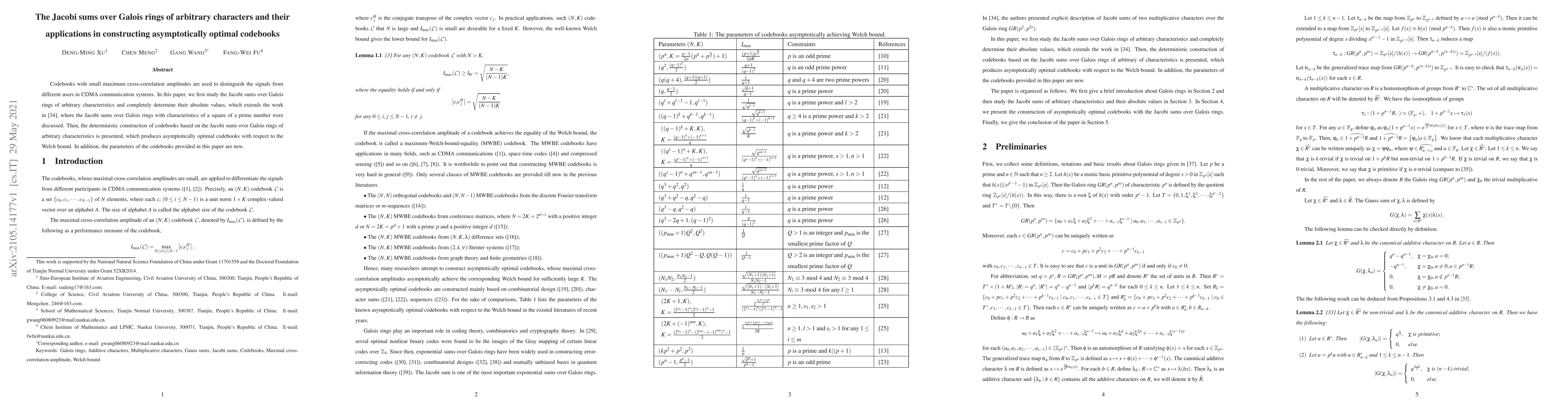 Codebooks with small maximum cross-correlation amplitudes are used to distinguish the signals from different users in CDMA communication systems. In this paper, we first study the Jacobi sums over Galois rings of arbitrary characteristics and completely determine their absolute values, which extends the work in [34], where the Jacobi sums over Galois rings with characteristics of a square of a prime number were discussed. Then, the deterministic construction of codebooks based on the Jacobi sums over Galois rings of arbitrary characteristics is presented, which produces asymptotically optimal codebooks with respect to the Welch bound. In addition, the parameters of the codebooks provided in this paper are new.