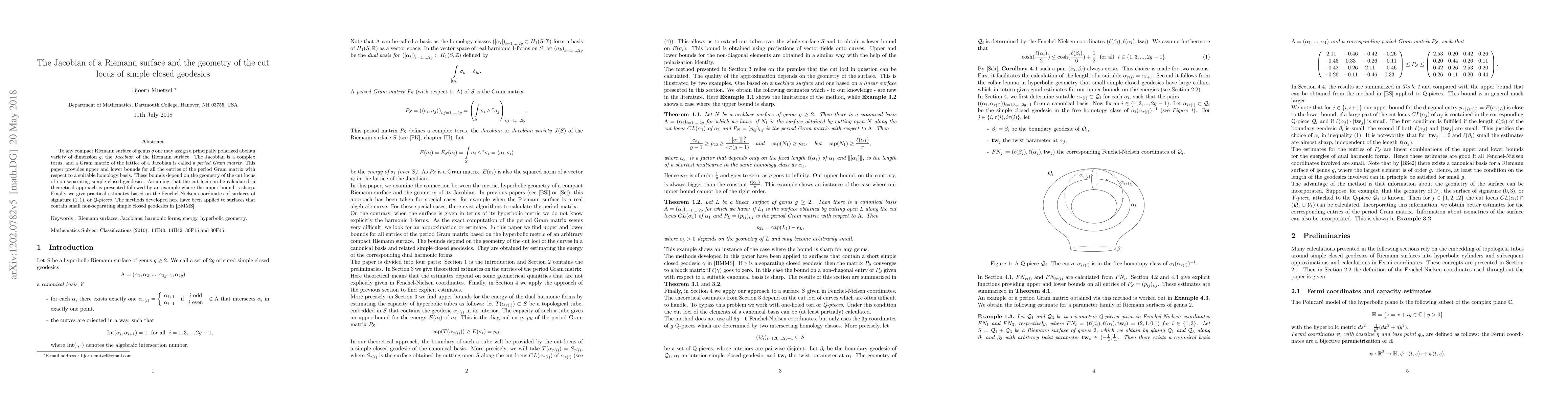 To any compact Riemann surface of genus g one may assign a principally polarized abelian variety of dimension g, the Jacobian of the Riemann surface. The Jacobian is a complex torus, and a Gram matrix of the lattice of a Jacobian is called a period Gram matrix. This paper provides upper and lower bounds for all the entries of the period Gram matrix with respect to a suitable homology basis. These bounds depend on the geometry of the cut locus of non-separating simple closed geodesics. Assuming that the cut loci can be calculated, a theoretical approach is presented followed by an example where the upper bound is sharp. Finally we give practical estimates based on the Fenchel-Nielsen coordinates of surfaces of signature (1,1), or Q-pieces. The methods developed here have been applied to surfaces that contain small non-separating simple closed geodesics in [BMMS].