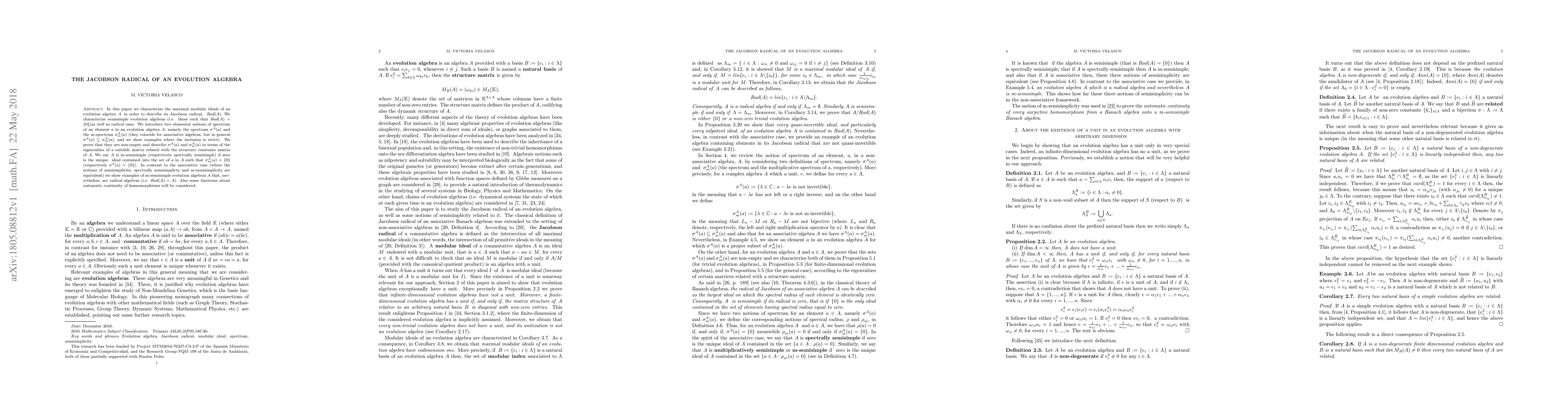 This paper characterizes the Jacobson radical of an evolution algebra $A$ by examining its maximal modular ideals and introducing notions of spectrum for elements within $A$. It distinguishes between semisimple and radical evolution algebras and explores the differences between semisimplicity, spectral semisimplicity, and m-semisimplicity in the non-associative context.