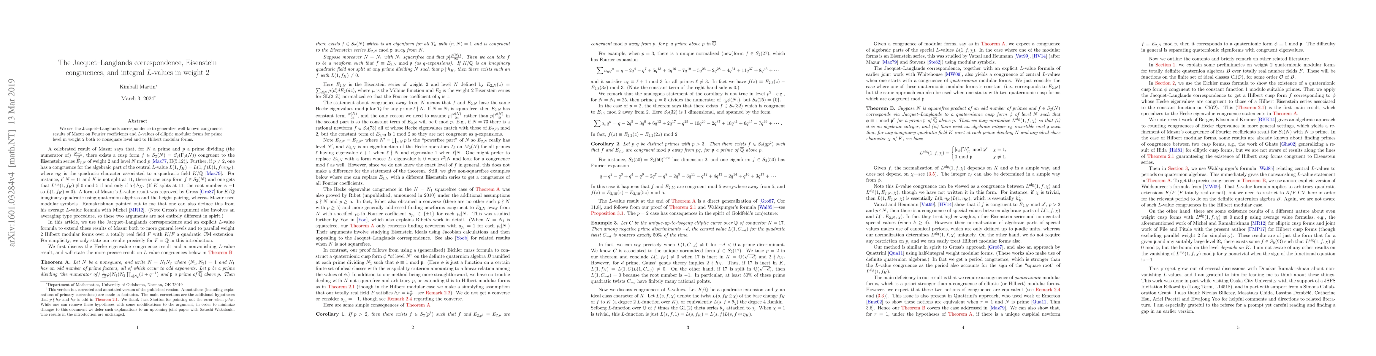 Summary: This paper uses the Jacquet-Langlands correspondence to extend Mazur's congruence results for elliptic modular forms to nonsquare levels and to Hilbert modular forms, focusing on integral L-values in weight 2.