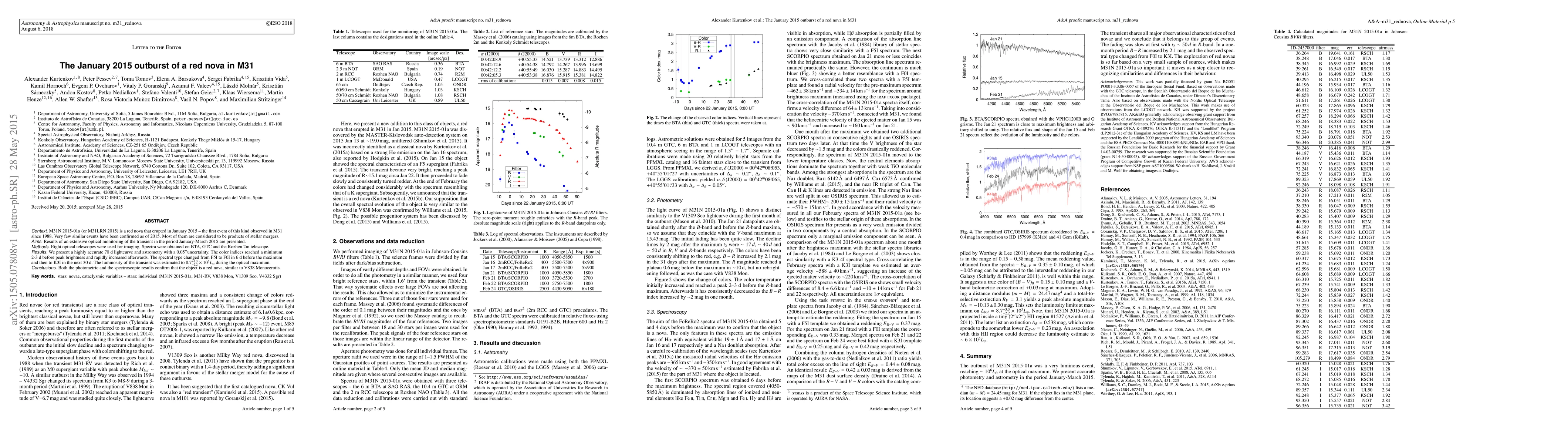 M31N 2015-01a (or M31LRN 2015) is a red nova that erupted in January 2015 -- the first event of this kind observed in M31 since 1988. Very few similar events have been confirmed as of 2015. Most of them are considered to be products of stellar mergers. Results of an extensive optical monitoring of the transient in the period January-March 2015 are presented. Eight optical telescopes were used for imaging. Spectra were obtained on BTA, GTC and the Rozhen 2m telescope. We present a highly accurate 70 d lightcurve and astrometry with a 0.05" uncertainty. The color indices reached a minimum 2-3 d before peak brightness and rapidly increased afterwards. The spectral type changed from F5I to F0I in 6 d before the maximum and then to K3I in the next 30 d. The luminosity of the transient was estimated to $8.7^{+3.3}_{-2.2}\times10^{5}L_{\odot}$ during the optical maximum. Both the photometric and the spectroscopic results confirm that the object is a red nova, similar to V838 Monocerotis.