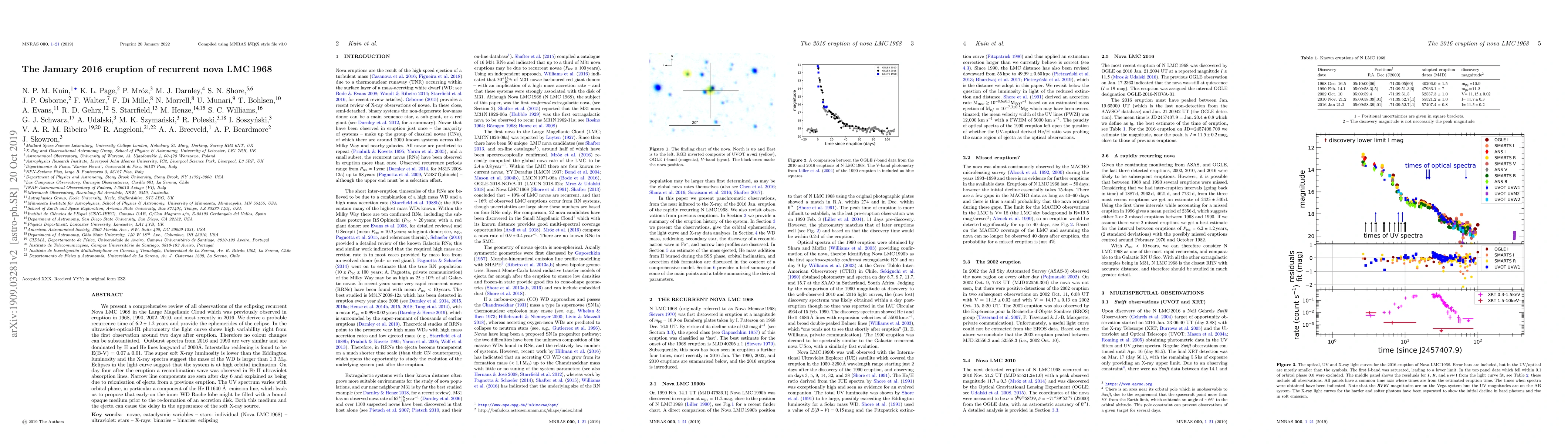 The study of recurrent nova LMC 1968 reveals a probable recurrence time of 6.2 years and high variability in ultraviolet-optical-IR photometry, suggesting the system is at high orbital inclination. The eruption's characteristics provide insights into the nature of these objects.