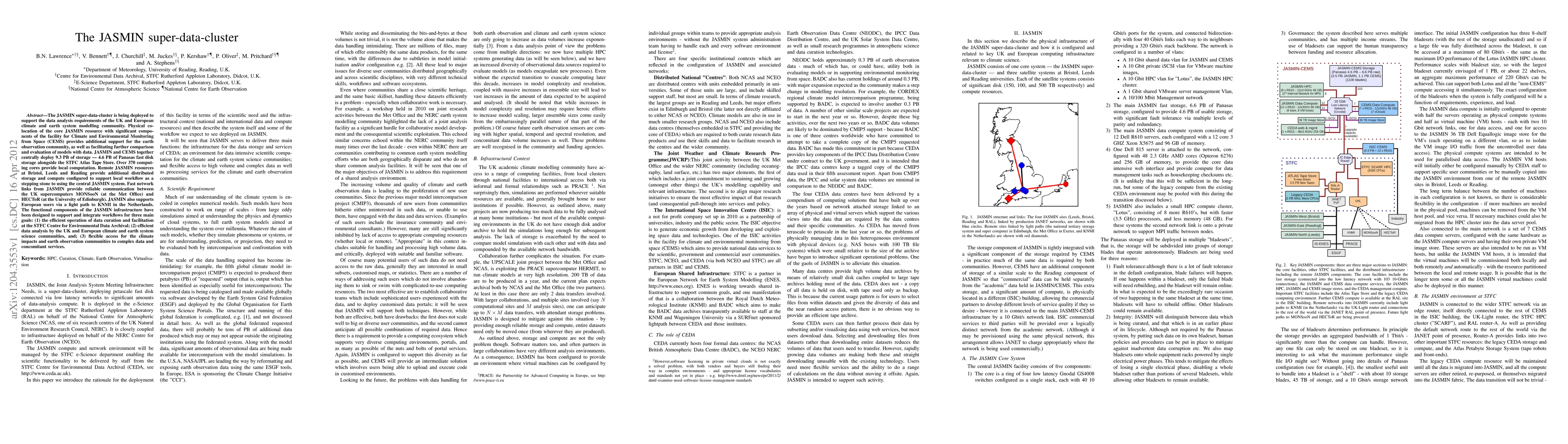 The JASMIN super-data-cluster is being deployed to support the data analysis requirements of the UK and European climate and earth system modelling community. Physical colocation of the core JASMIN resource with significant components of the facility for Climate and Environmental Monitoring from Space (CEMS) provides additional support for the earth observation community, as well as facilitating further comparison and evaluation of models with data. JASMIN and CEMS together centrally deploy 9.3 PB of storage - 4.6 PB of Panasas fast disk storage alongside the STFC Atlas Tape Store. Over 370 computing cores provide local computation. Remote JASMIN resources at Bristol, Leeds and Reading provide additional distributed storage and compute configured to support local workflow as a stepping stone to using the central JASMIN system. Fast network links from JASMIN provide reliable communication between the UK supercomputers MONSooN (at the Met Office) and HECToR (at the University of Edinburgh). JASMIN also supports European users via a light path to KNMI in the Netherlands. The functional components of the JASMIN infrastructure have been designed to support and integrate workflows for three main goals: (1) the efficient operation of data curation and facilitation at the STFC Centre for Environmental Data Archival; (2) efficient data analysis by the UK and European climate and earth system science communities, and; (3) flexible access for the climate impacts and earth observation communities to complex data and concomitant services.