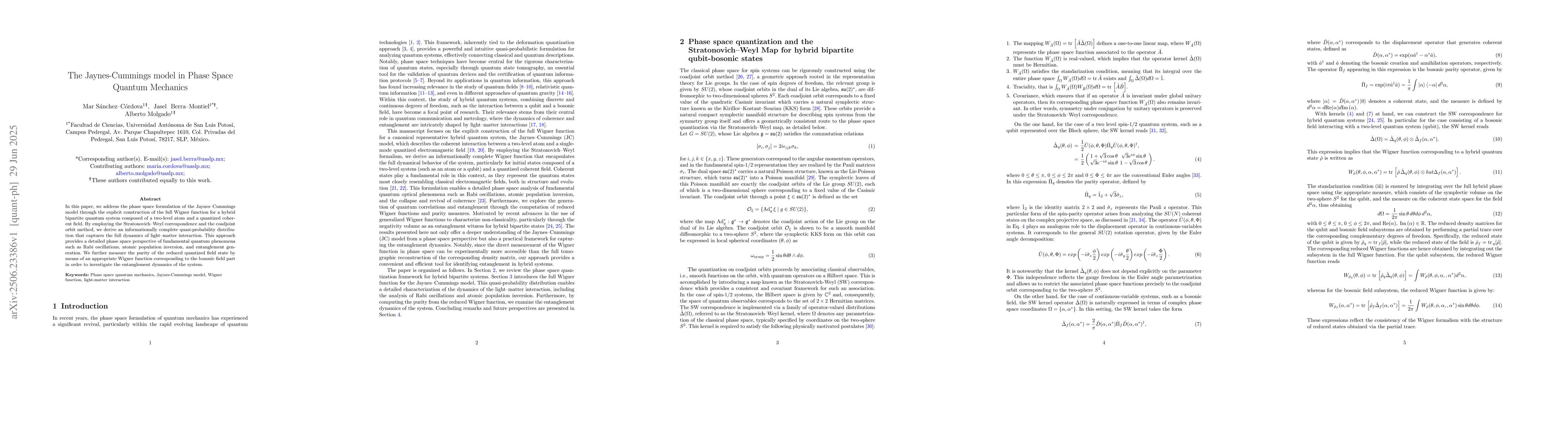 In this paper, we address the phase space formulation of the Jaynes-Cummings model through the explicit construction of the full Wigner function for a hybrid bipartite quantum system composed of a two-level atom and a quantized coherent field. By employing the Stratonovich-Weyl correspondence and the coadjoint orbit method, we derive an informationally complete quasi-probability distribution that captures the full dynamics of light-matter interaction. This approach provides a detailed phase space perspective of fundamental quantum phenomena such as Rabi oscillations, atomic population inversion, and entanglement generation. We further measure the purity of the reduced quantized field state by means of an appropriate Wigner function corresponding to the bosonic field part in order to investigate the entanglement dynamics of the system.