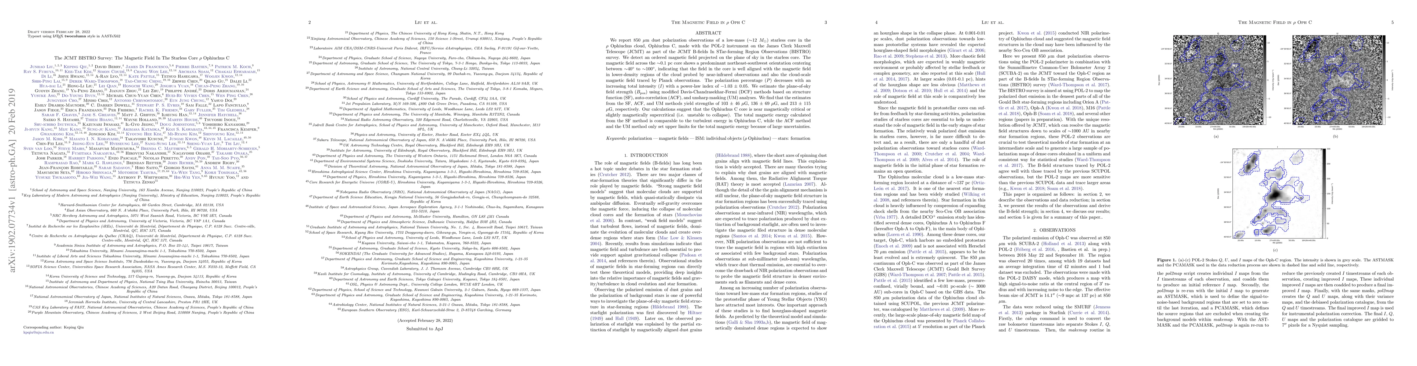The JCMT BISTRO survey reveals an ordered magnetic field in the starless core Ophiuchus C within the ρ Ophiuchus cloud, showing alignment with the cloud's magnetic field. The core's magnetic field strength estimates suggest it is near magnetically critical, with total magnetic energy comparable to turbulent energy.