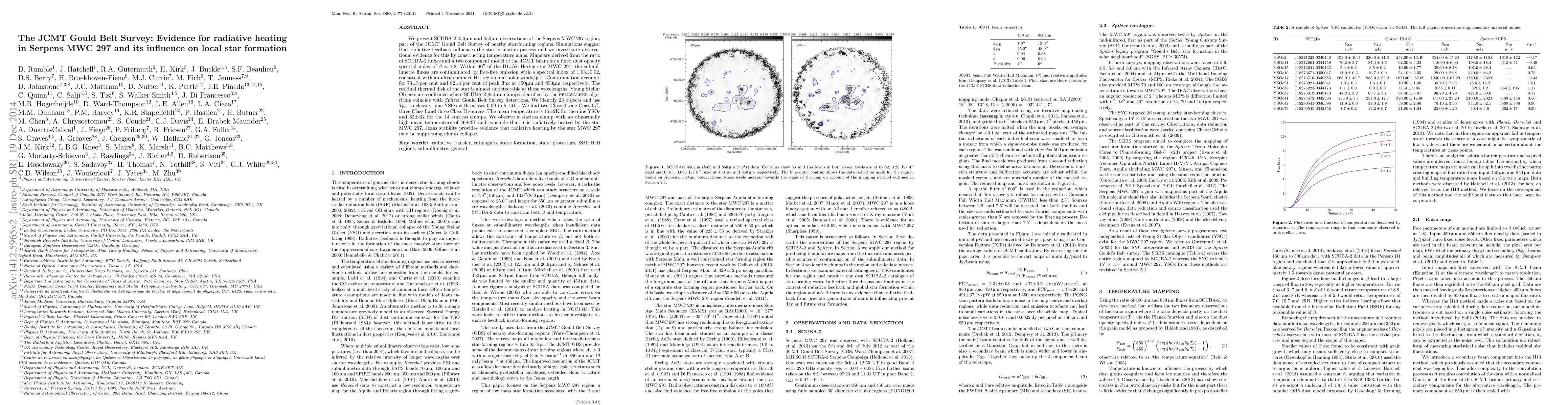 We present SCUBA-2 450micron and 850micron observations of the Serpens MWC 297 region, part of the JCMT Gould Belt Survey of nearby star-forming regions. Simulations suggest that radiative feedback influences the star-formation process and we investigate observational evidence for this by constructing temperature maps. Maps are derived from the ratio of SCUBA-2 fluxes and a two component model of the JCMT beam for a fixed dust opacity spectral index of beta = 1.8. Within 40 of the B1.5Ve Herbig star MWC 297, the submillimetre fluxes are contaminated by free-free emission with a spectral index of 1.03+-0.02, consistent with an ultra-compact HII region and polar winds/jets. Contamination accounts for 73+-5 per cent and 82+-4 per cent of peak flux at 450micron and 850micron respectively. The residual thermal disk of the star is almost undetectable at these wavelengths. Young Stellar Objects are confirmed where SCUBA-2 850micron clumps identified by the fellwalker algorithm coincide with Spitzer Gould Belt Survey detections. We identify 23 objects and use Tbol to classify nine YSOs with masses 0.09 to 5.1 Msun. We find two Class 0, one Class 0/I, three Class I and three Class II sources. The mean temperature is 15+-2K for the nine YSOs and 32+-4K for the 14 starless clumps. We observe a starless clump with an abnormally high mean temperature of 46+-2K and conclude that it is radiatively heated by the star MWC 297. Jeans stability provides evidence that radiative heating by the star MWC 297 may be suppressing clump collapse.