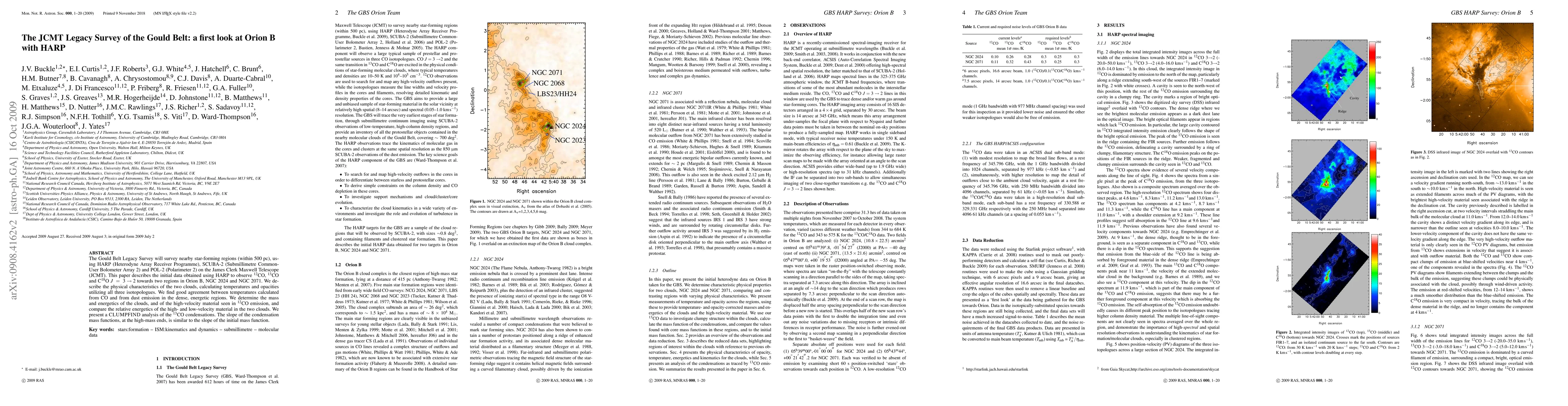 This paper presents initial data from the JCMT Legacy Survey of the Gould Belt, focusing on Orion B using HARP. It analyzes 12CO, 13CO, and C18O emissions to determine physical characteristics, mass, and energetics of NGC 2024 and NGC 2071, finding good agreement between CO and dust emission temperatures and a similar slope of condensation mass functions to the initial mass function.