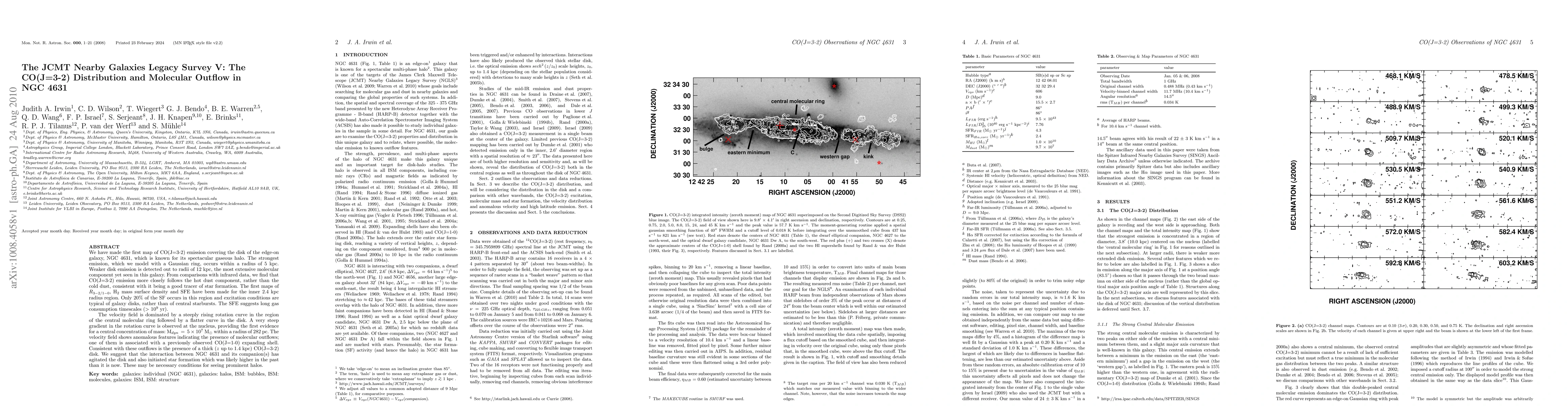 We have made the first map of CO(J=3-2) emission covering the disk of the edge-on galaxy, NGC~4631, which is known for its spectacular gaseous halo. The strongest emission, which we model with a Gaussian ring,occurs within a radius of 5 kpc. Weaker disk emission is detected out to radii of 12 kpc, the most extensive molecular component yet seen in this galaxy. From comparisons with infrared data, we find that CO(J=3-2) emission more closely follows the hot dust component, rather than the cold dust,consistent with it being a good tracer of star formation. The first maps of $R_{3-2/1-0}$, H$_2$ mass surface density and SFE have been made for the inner 2.4 kpc radius region. Only 20\% of the SF occurs in this region and excitation conditions are typical of galaxy disks, rather than of central starbursts. The SFE suggests long gas consumption timescales ($>$ $10^9$ yr). The velocity field is dominated by a steeply rising rotation curve in the region of the central molecular ring followed by a flatter curve in the disk. A very steep gradient in the rotation curve is observed at the nucleus, providing the first evidence for a central concentration of mass: M$_{dyn}\,=\,5\,\times\,10^7$ M$_\odot$ within a radius of 282 pc. The velocity field shows anomalous features indicating the presence of molecular outflows; one of them is associated with a previously observed CO(J=1-0) expanding shell. Consistent with these outflows is the presence of a thick ($z$ up to $1.4$ kpc) CO(J=3-2) disk. We suggest that the interaction between NGC~4631 and its companion(s) has agitated the disk and also initiated star formation which was likely higher in the past than it is now. These may be necessary conditions for seeing prominent halos.