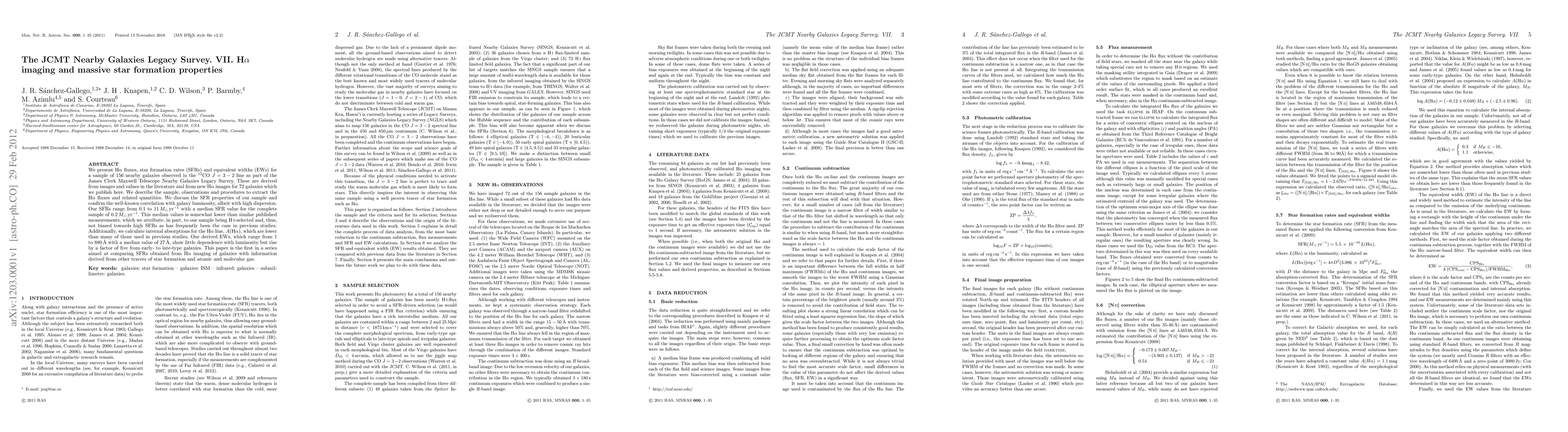 We present H\alpha{} fluxes, star formation rates (SFRs) and equivalent widths (EWs) for a sample of 156 nearby galaxies observed in the 12CO J=3-2 line as part of the James Clerk Maxwell Telescope Nearby Galaxies Legacy Survey. These are derived from images and values in the literature and from new H\alpha{} images for 72 galaxies which we publish here. We describe the sample, observations and procedures to extract the H\alpha{} fluxes and related quantities. We discuss the SFR properties of our sample and confirm the well-known correlation with galaxy luminosity, albeit with high dispersion. Our SFRs range from 0.1 to 11 Msun yr-1 with a median SFR value for the complete sample of 0.2 Msun yr-1. This median values is somewhat lower than similar published measurements, which we attribute, in part, to our sample being HI-selected and, thus, not biased towards high SFRs as has frequently been the case in previous studies. Additionally, we calculate internal absorptions for the H\alpha{} line, A(H\alpha{}), which are lower than many of those used in previous studies. Our derived EWs, which range from 1 to 880\AA{} with a median value of 27\AA{}, show little dependence with luminosity but rise by a factor of five from early- to late-type galaxies. This paper is the first in a series aimed at comparing SFRs obtained from H\alpha{} imaging of galaxies with information derived from other tracers of star formation and atomic and molecular gas.