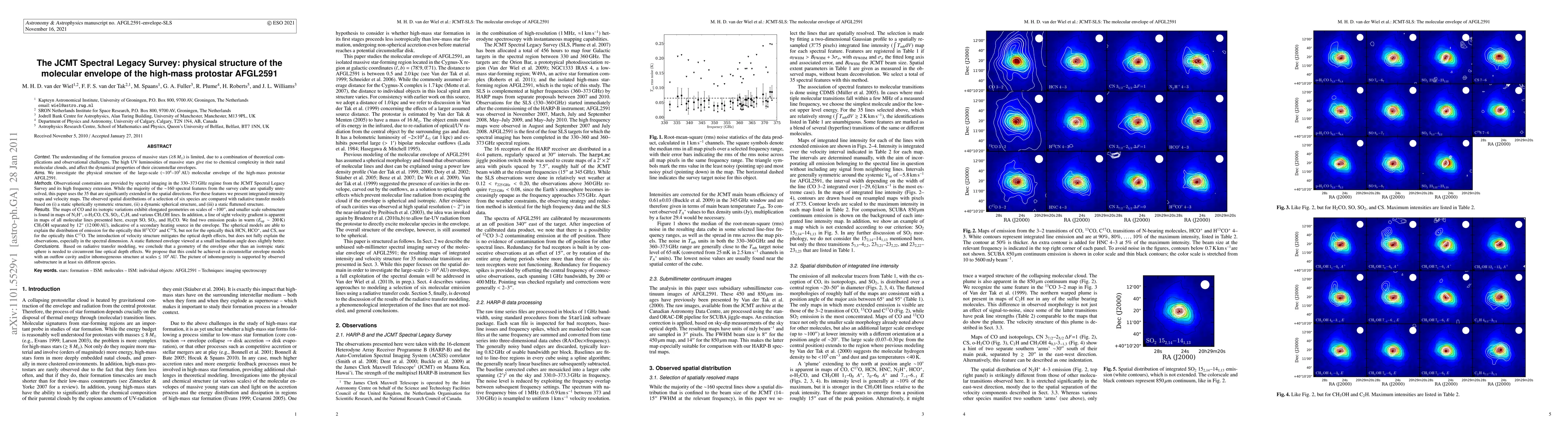 This study uses JCMT Spectral Legacy Survey data to analyze the physical structure of the molecular envelope around the high-mass protostar AFGL2591, revealing complex geometries and substructures. The findings suggest that a non-spherical, possibly inhomogeneous envelope with outflow cavities better explains the observed molecular line distributions.