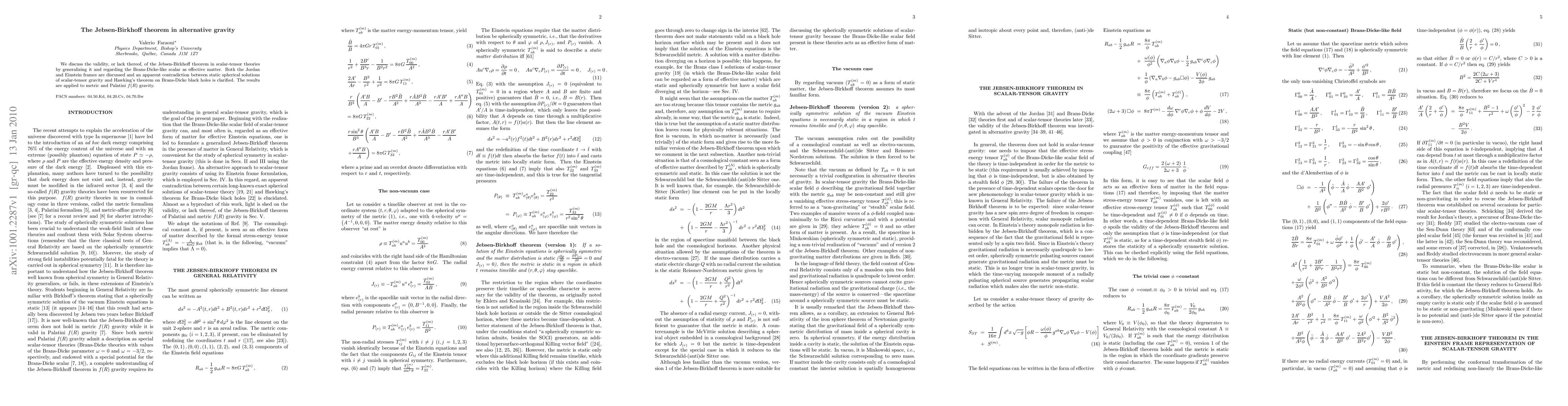 We discuss the validity, or lack thereof, of the Jebsen-Birkhoff theorem in scalar-tensor theories by generalizing it and regarding the Brans-Dicke-like scalar as effective matter. Both the Jordan and Einstein frames are discussed and an apparent contradiction between static spherical solutions of scalar-tensor gravity and Hawking's theorem on Brans-Dicke black holes is clarified. The results are applied to metric and Palatini f(R) gravity.