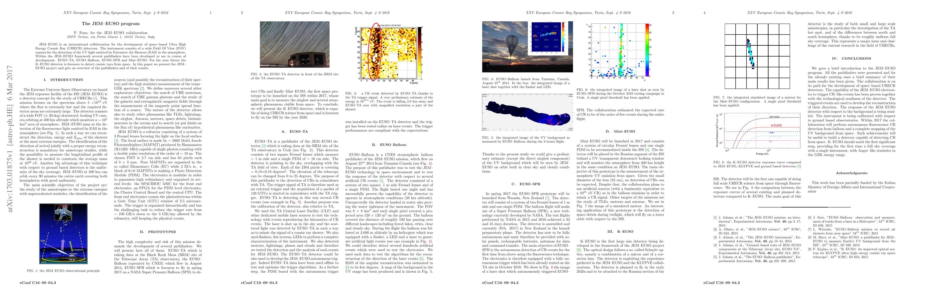 The JEM-EUSO program aims to develop space-based detectors for Ultra High Energy Cosmic Ray (UHECR) observation using a wide Field Of View camera to detect UV light from Extensive Air Showers. Several pathfinders, including EUSO-TA, EUSO-Balloon, EUSO-SPB, and Mini-EUSO, are being developed to pave the way for the K-EUSO detector.