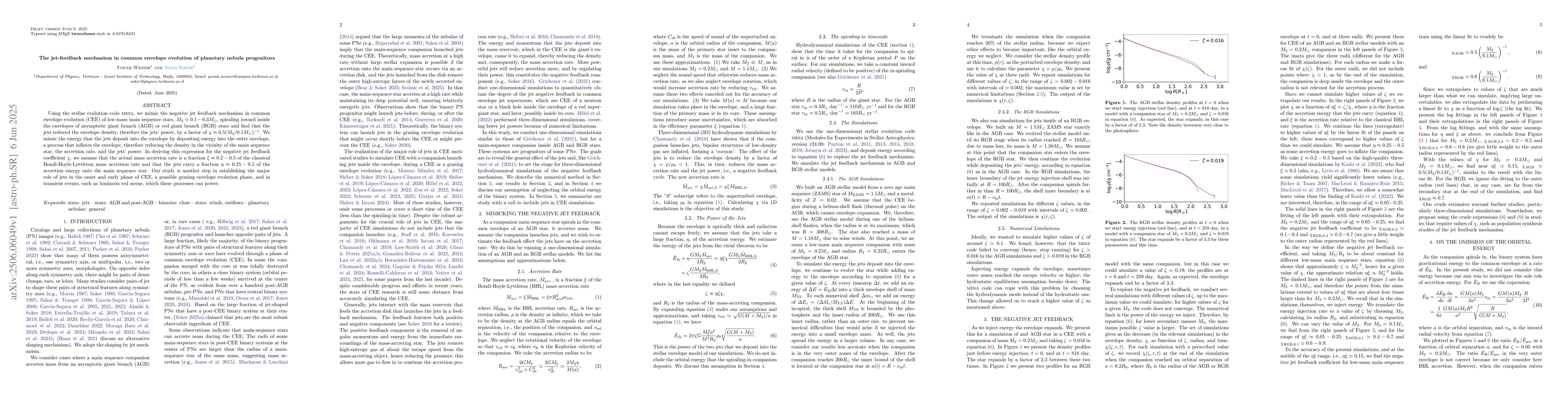 Using the stellar evolution code MESA, we mimic the negative jet feedback mechanism in common envelope evolution (CEE) of low-mass main sequence stars, M2=0.1-0.3Mo, spiraling inward inside the envelopes of asymptotic giant branch (AGB) or red giant branch (RGB) stars and find that the jets reduced the envelope density, therefore the jets' power, by a factor of ~0.5/(M2/0.1Mo). We mimic the energy that the jets deposit into the envelope by depositing energy into the outer envelope, a process that inflates the envelope, therefore reducing the density in the vicinity of the main sequence star, the accretion rate, and the jets' power. In deriving this expression for the negative jet feedback coefficient, we assume that the actual mass accretion rate is a fraction 0.2-0.5 of the classical Bondi-Hoyle-Lyttleton mass accretion rate and that the jets carry a fraction 0.25-0.5 of the accretion energy onto the main sequence star. Our study is another step in establishing the major role of jets in the onset and early phase of CEE, a possible grazing envelope evolution phase, and in transient events, such as luminous red novae, which these processes can power.