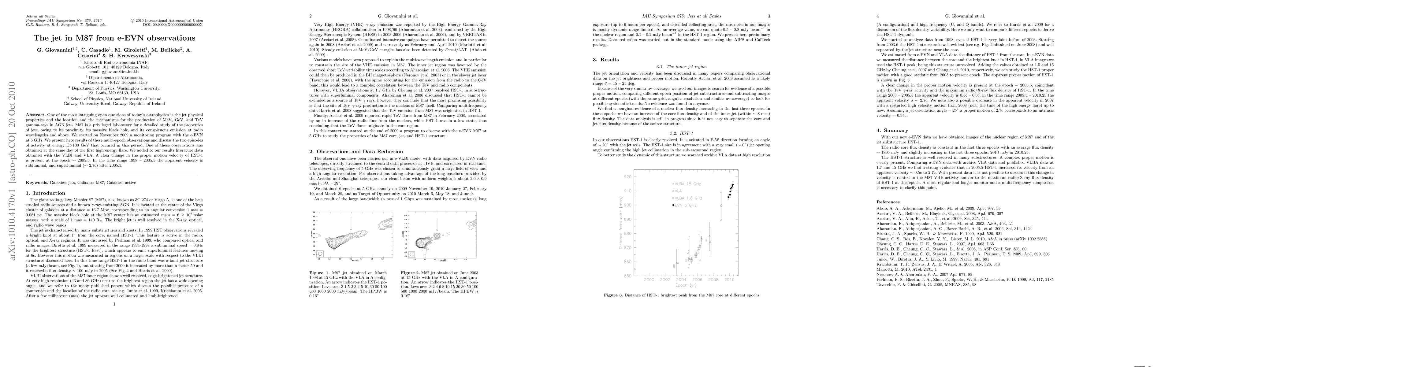 One of the most intriguing open questions of today's astrophysics is the jet physical properties and the location and the mechanisms for the production of MeV, GeV, and TeV gamma-rays in AGN jets. M87 is a privileged laboratory for a detailed study of the properties of jets, owing to its proximity, its massive black hole, and its conspicuous emission at radio wavelengths and above. We started on November 2009 a monitoring program with the e-EVN at 5 GHz. We present here results of these multi-epoch observations and discuss the two episodes of activity at energy E>100 GeV that occured in this period. One of these observations was obtained at the same day of the first high energy flare. We added to our results literature data obtained with the VLBI and VLA. A clear change in the proper motion velocity of HST-1 is present at the epoch ~ 2005.5. In the time range 1998 -- 2005.5 the apparent velocity is subluminal, and superluminal (~ 2.7c) after 2005.5.
