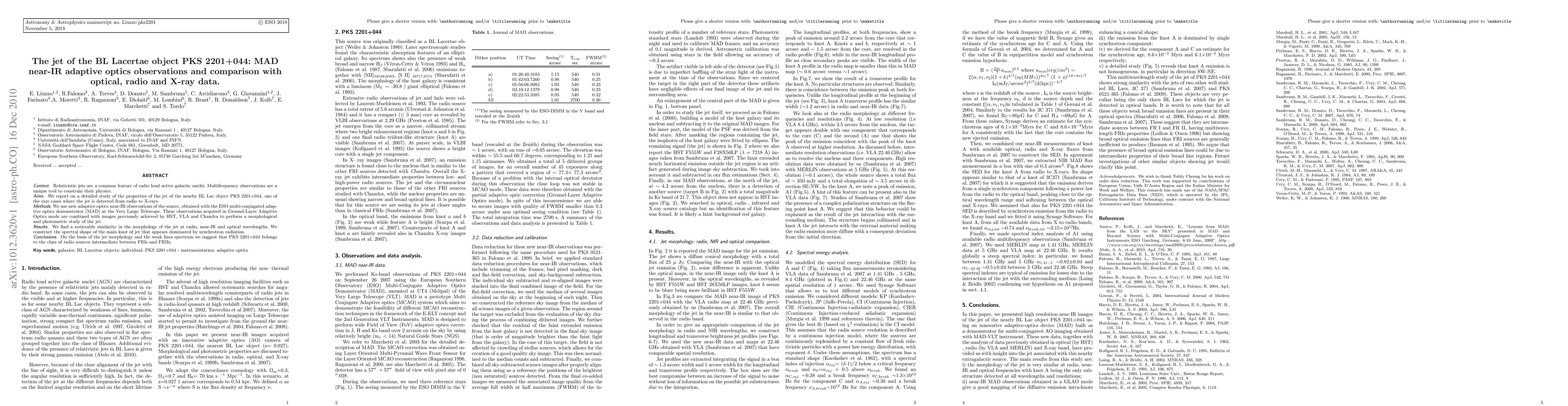 This study uses MAD near-IR adaptive optics observations to analyze the jet of BL Lac object PKS 2201+044, comparing it with optical, radio, and X-ray data. The findings suggest a similarity in jet morphology across different wavelengths and classify PKS 2201+044 as an intermediate radio source between FRIs and FRIIs.