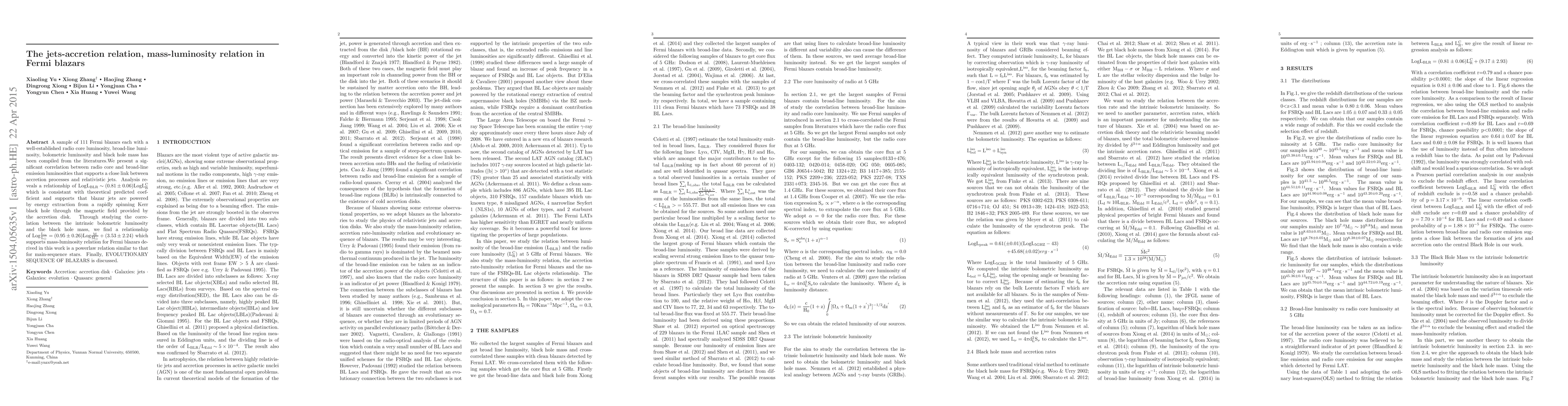 This study investigates the correlation between radio core and broad-line emission luminosities in 111 Fermi blazars, revealing a significant link between accretion processes and relativistic jets. The derived mass-luminosity relation suggests a powerlaw similar to main-sequence stars, supporting blazar jets' energy extraction from rapidly spinning black holes via magnetic fields.