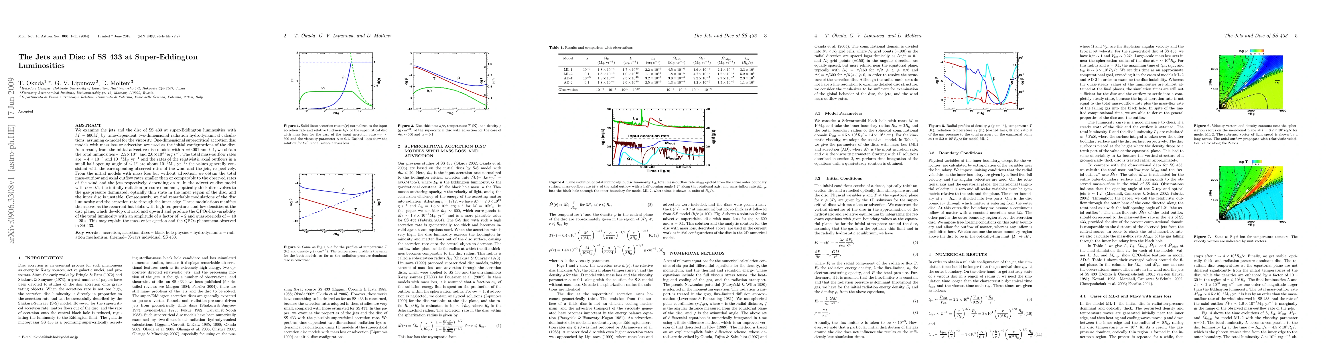 We examine the jets and the disc of SS 433 at super-Eddington luminosities with 600 times Eddington critical accretion rate by time-dependent two-dimensional radiation hydrodynamical calculations, assuming alpha-model for the viscosity. One-dimensional supercritical accretion disc models with mass loss or advection are used as the initial configurations of the disc. As a result, from the initial advective disc models with alpha =0.001 and 0.1, we obtain the total luminosities 2.5x10^{40} and 2.0x10^{40} erg/s. The total mass-outflow rates are 4x10^{-5} and 10^{-4} solar-mass/yr and the rates of the relativistic axial outflows in a small half opening angle of 1 degree are about 10^{-6} solar-mass/yr: the values generally consistent with the corresponding observed rates of the wind and the jets, respectively. From the initial models with mass loss but without advection, we obtain the total mass-outflow and axial outflow rates smaller than or comparable to the observed rates of the wind and the jets respectively, depending on alpha. In the advective disc model with alpha=0.1, the initially radiation-pressure dominant, optically thick disc evolves to the gas-pressure dominated, optically thin state in the inner region of the disc, and the inner disc is unstable. Consequently, we find remarkable modulations of the disc luminosity and the accretion rate through the inner edge. These modulations manifest themselves as the recurrent hot blobs with high temperatures and low densities at the disc plane, which develop outward and upward and produce the QPOs-like variability of the total luminosity with an amplitude of a factor of 2 and quasi-periods of 10 -- 25 s. This may explain the massive jet ejection and the QPOs phenomena observed in SS 433.