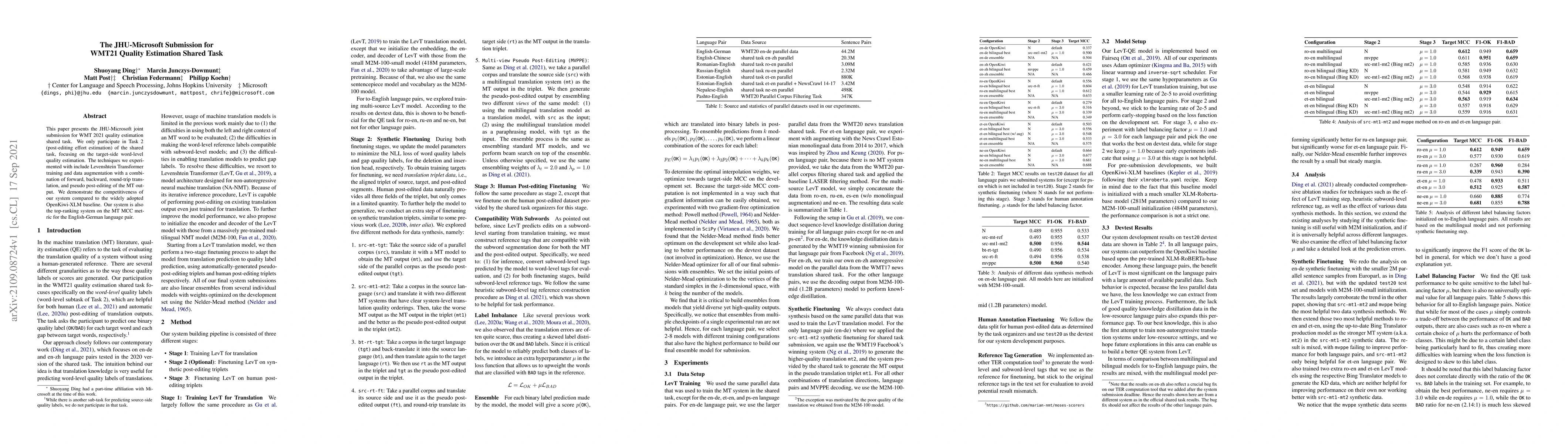 This paper details the JHU-Microsoft team's participation in the WMT 2021 quality estimation shared task, specifically focusing on post-editing effort estimation using techniques like Levenshtein Transformer training and data augmentation. The system outperformed the OpenKiwi-XLM baseline and ranked first for the English-German pair on the MT MCC metric.