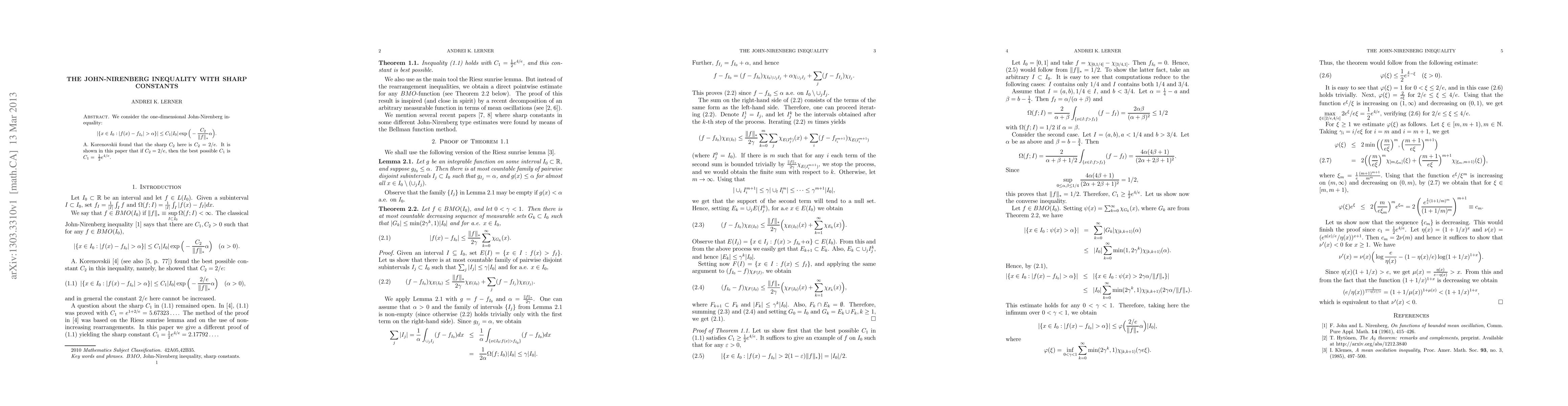 This paper investigates the one-dimensional John-Nirenberg inequality, proving that the optimal constant $C_2$ is $2/e$ and determining the best possible constant $C_1$ to be $\frac{1}{2}e^{4/e}$ when $C_2=2/e$.