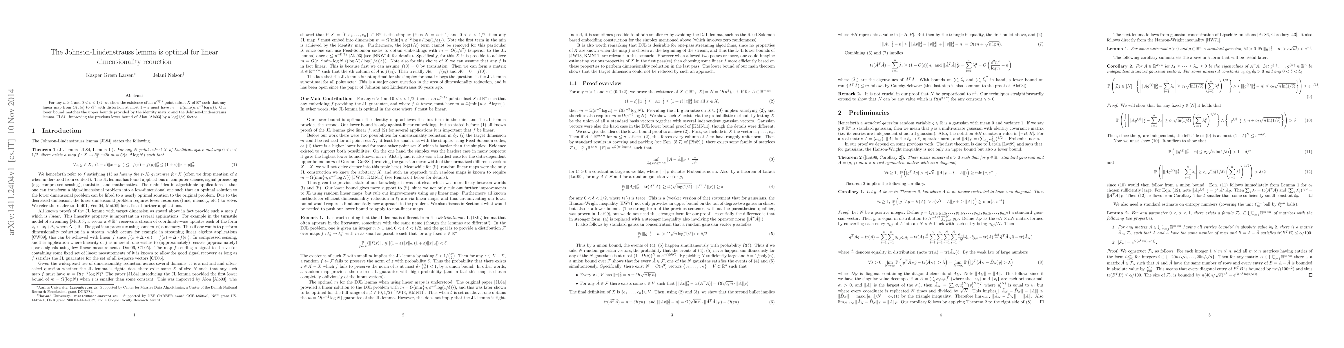This paper establishes that the Johnson-Lindenstrauss lemma is optimal for linear dimensionality reduction, proving a lower bound matching the upper bound for any $n$ and $\varepsilon$, and improving upon Alon's previous lower bound by a $\log(1/\varepsilon)$ factor.
